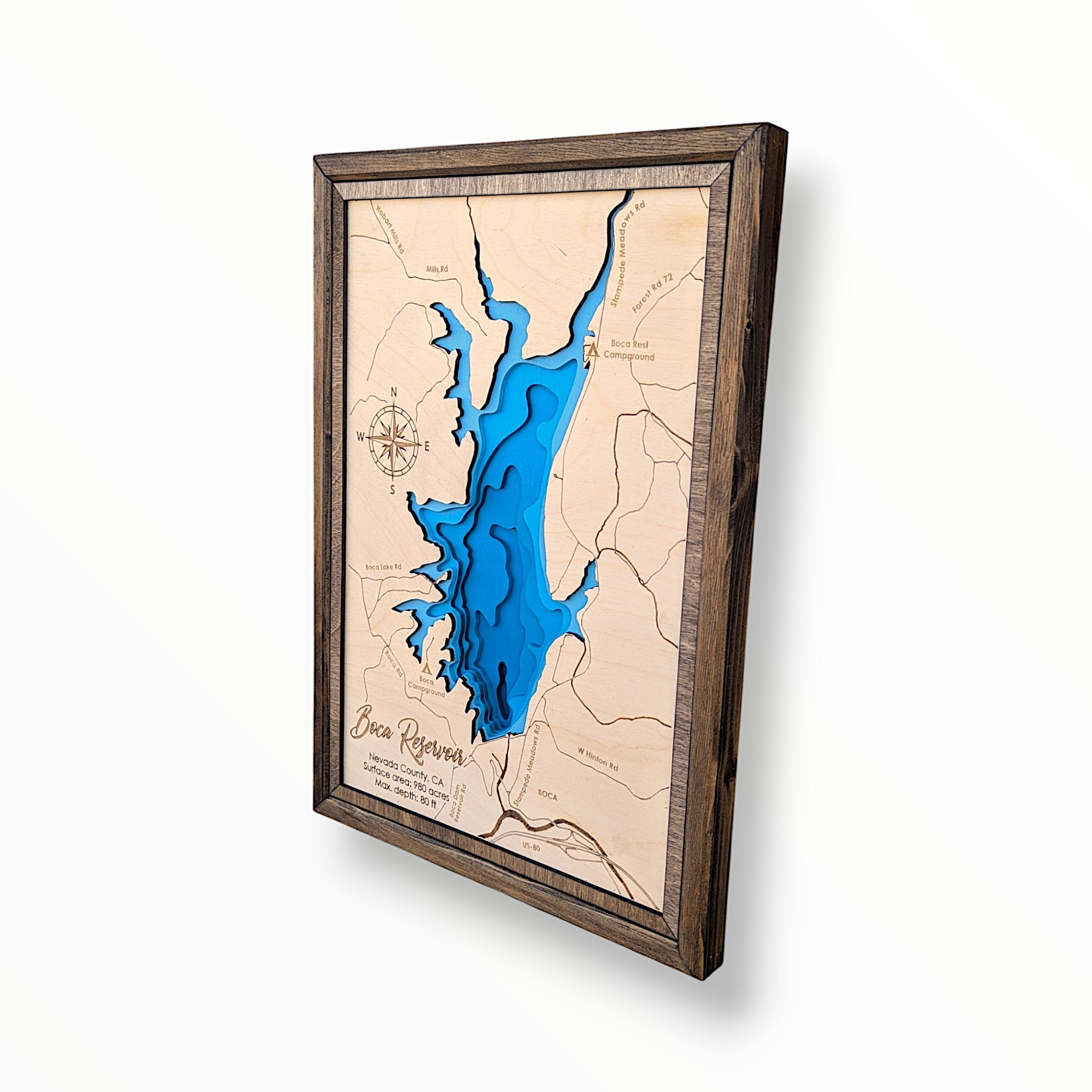 - Precision Laser Cutting: Crafted from sustainable, high-quality wood, this map captures the detailed bathymetric features of Boca Reservoir with crisp, clean lines.