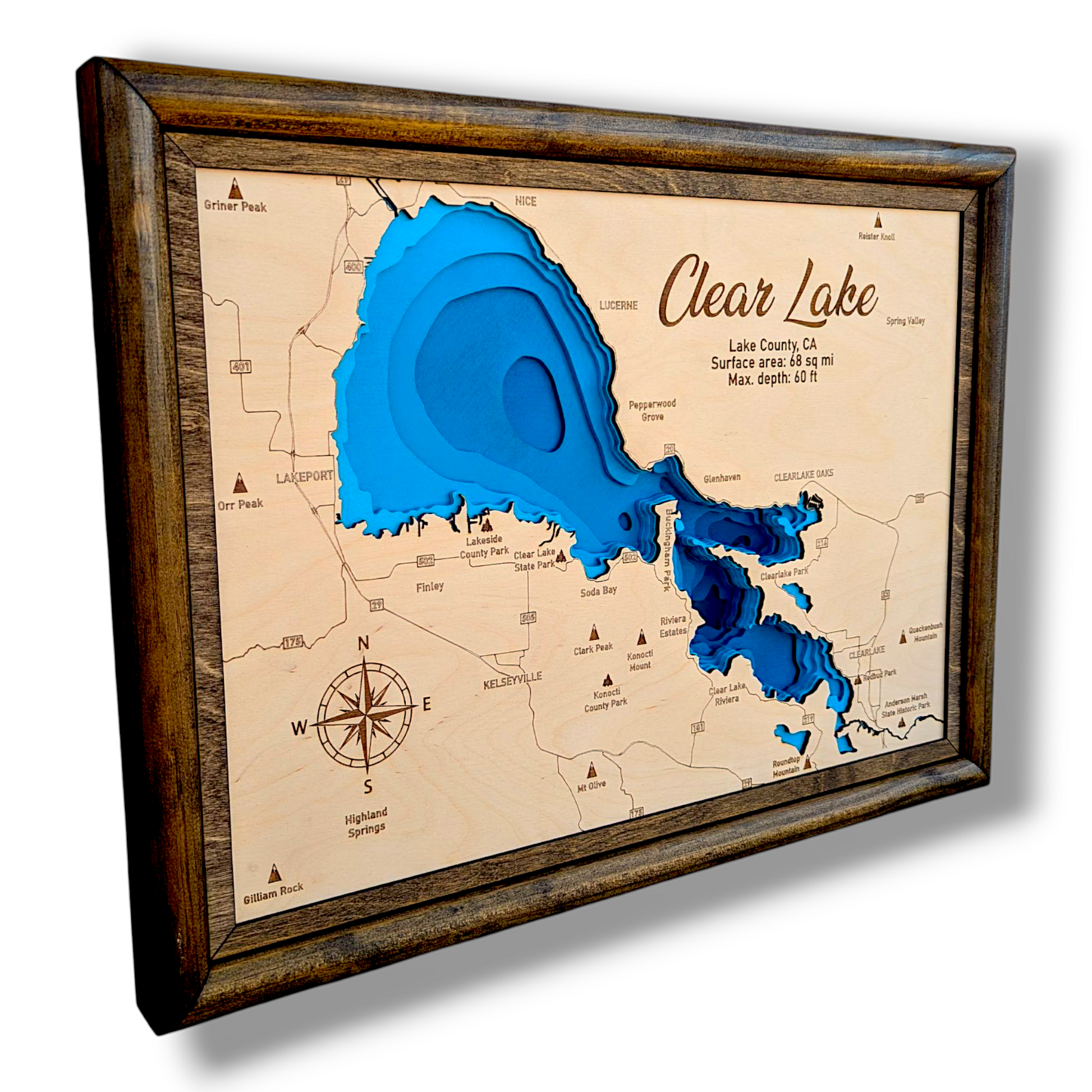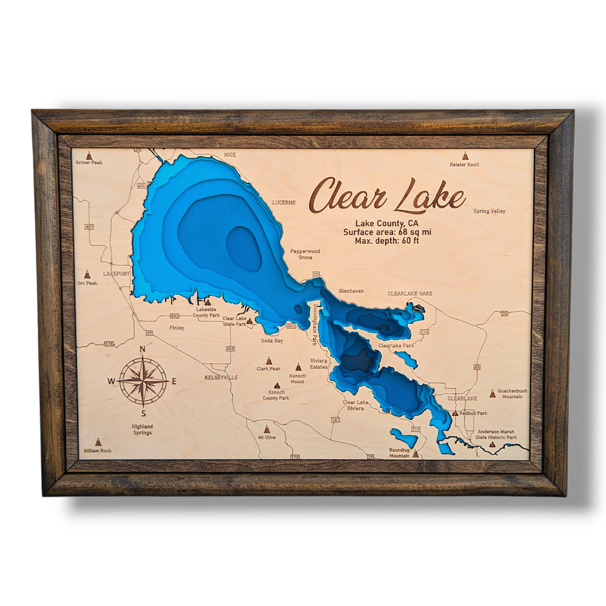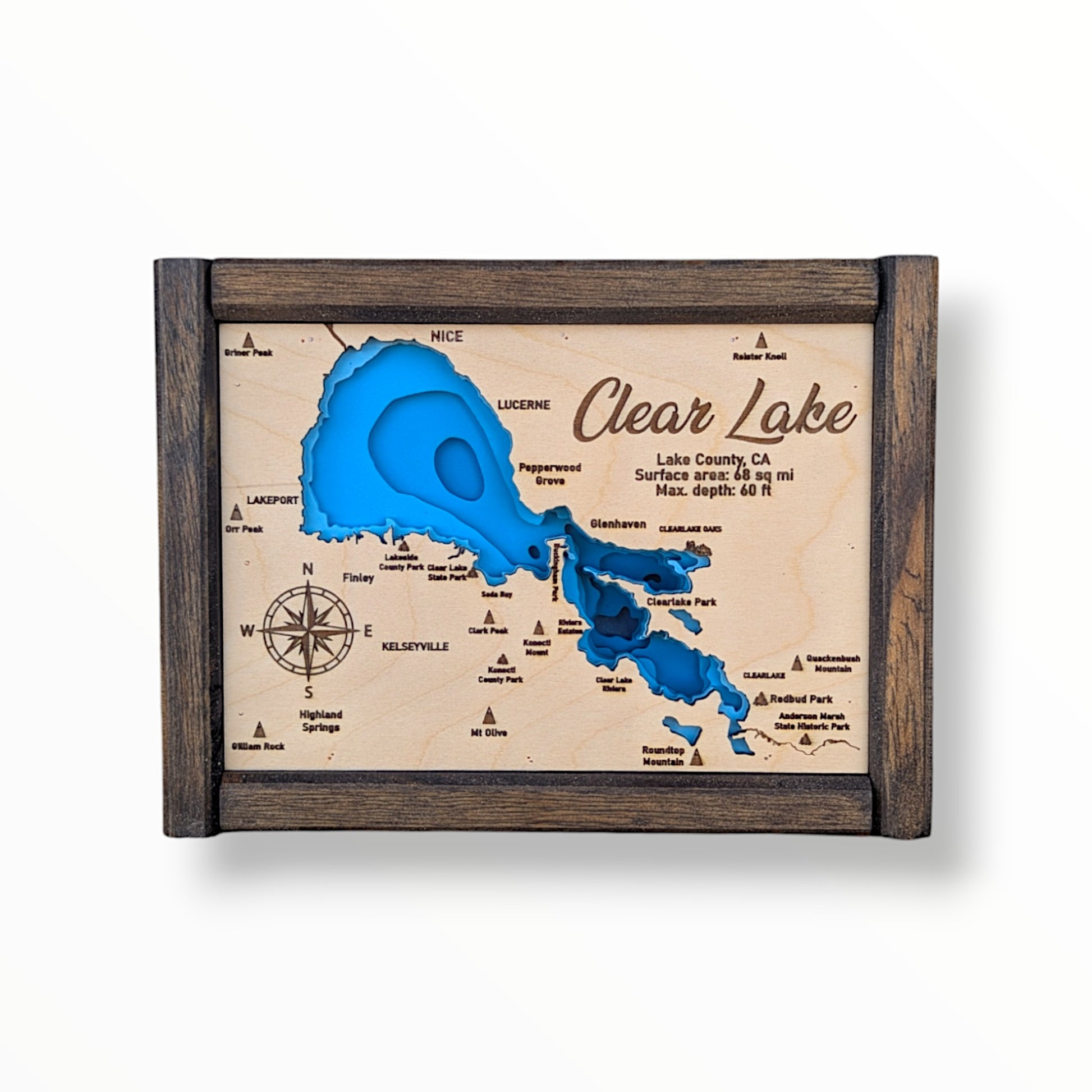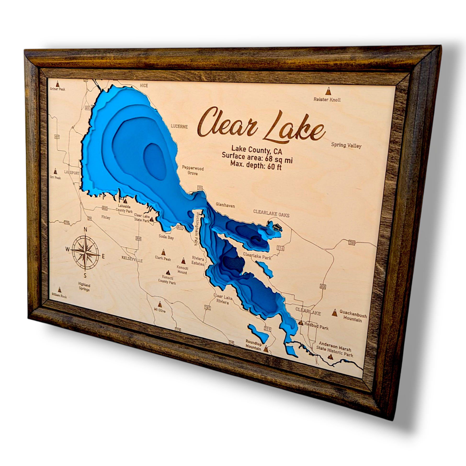 Explore the timeless allure of Clear Lake, California, with this meticulously laser-cut wood bathymetry map. As the largest natural freshwater lake located entirely within the state, Clear Lake holds a special place in California’s rich landscape. This map beautifully captures its unique underwater features, bringing its hidden depths to life.