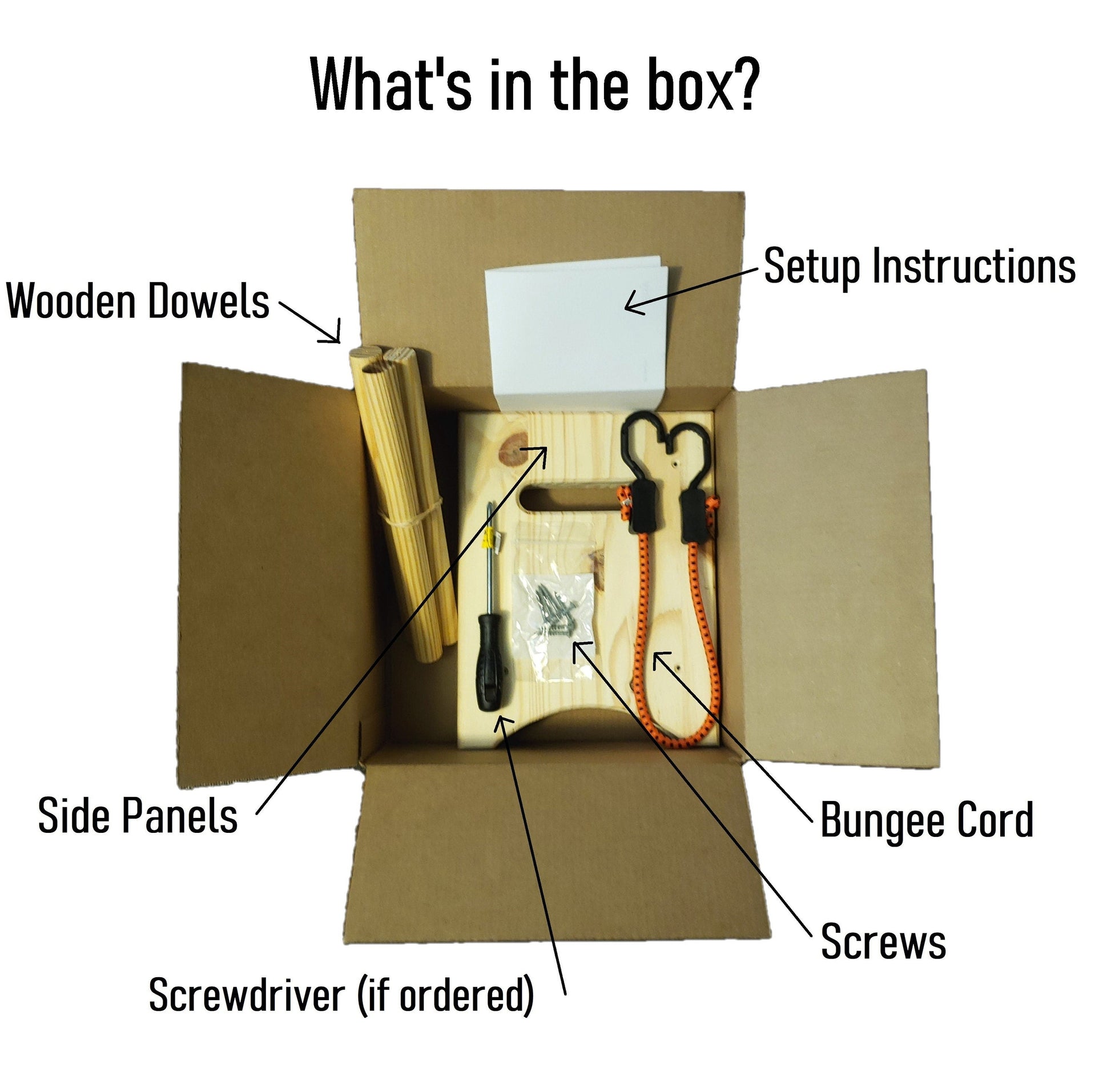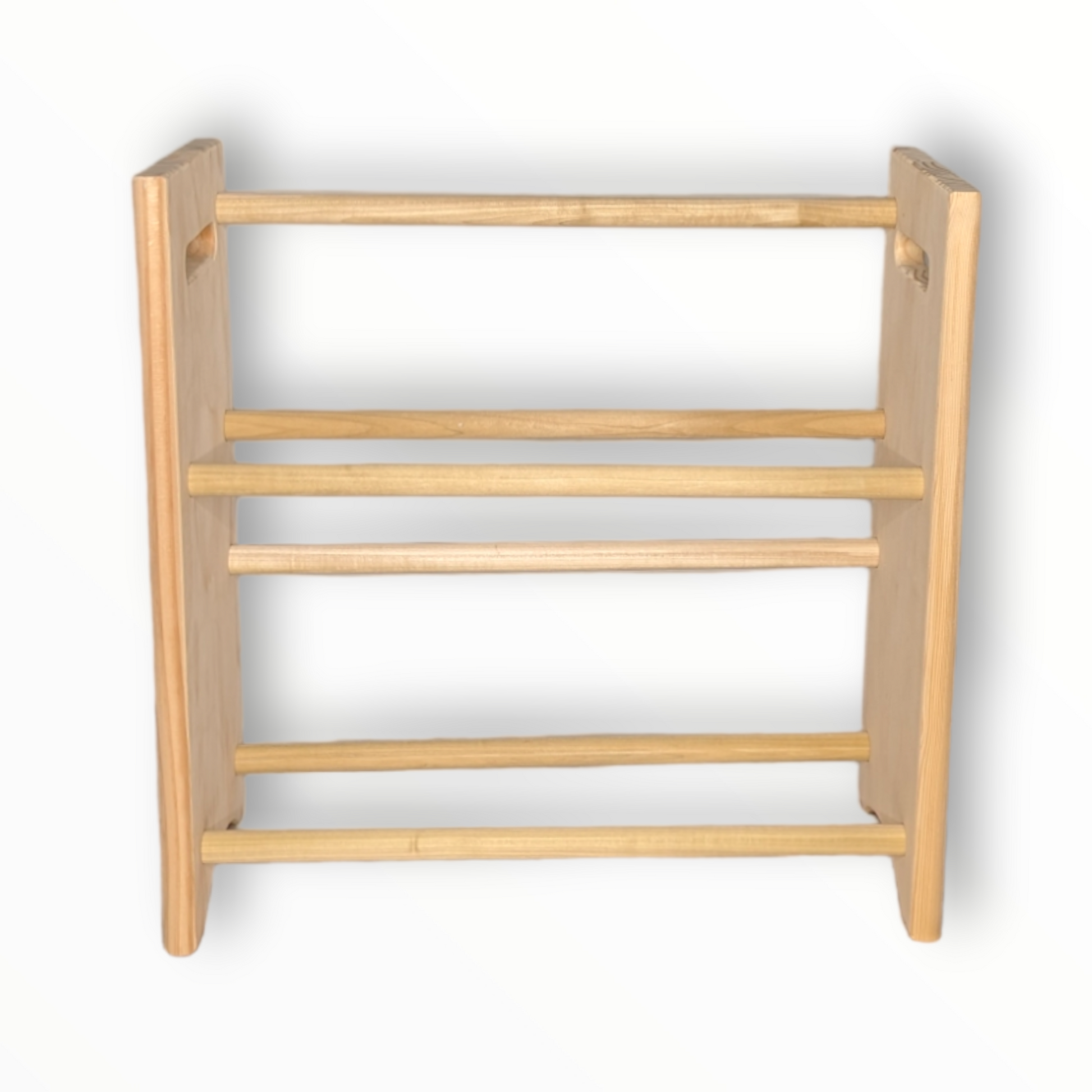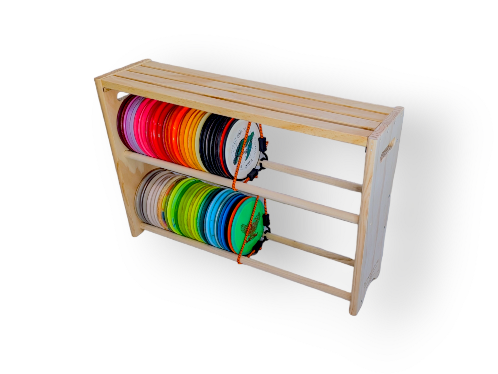 Design: All racks have beveled edges to ensure comfort when touching or moving the racks. They are built with 1" thick pine to ensure stability. Discs are nestled within three 1" dowels and each level comes with one bungee cord to ensure they won't fall out unless completely tipped over. The racks are sanded to a smooth finish and may be stained/clearcoated if that option is selected.