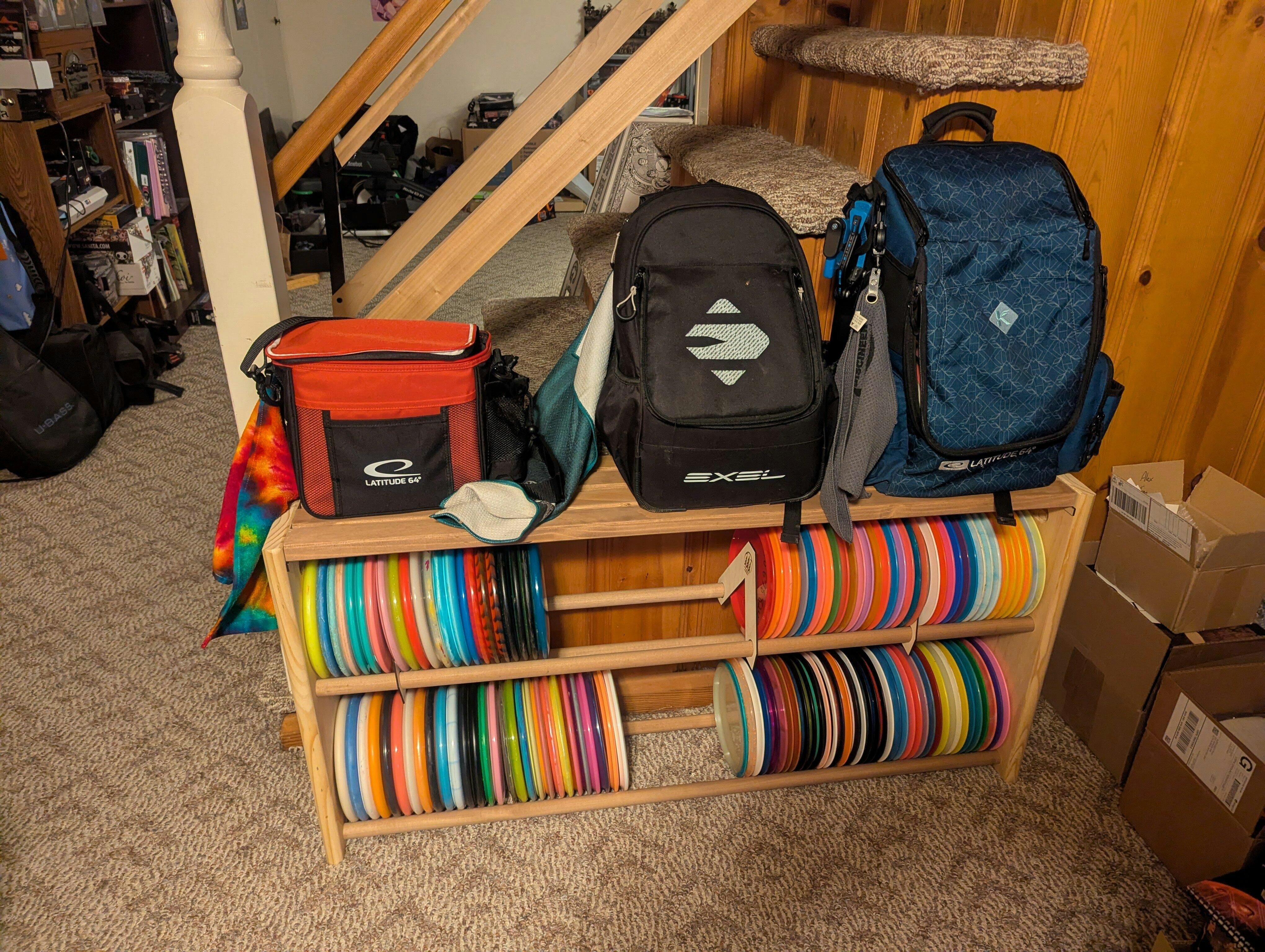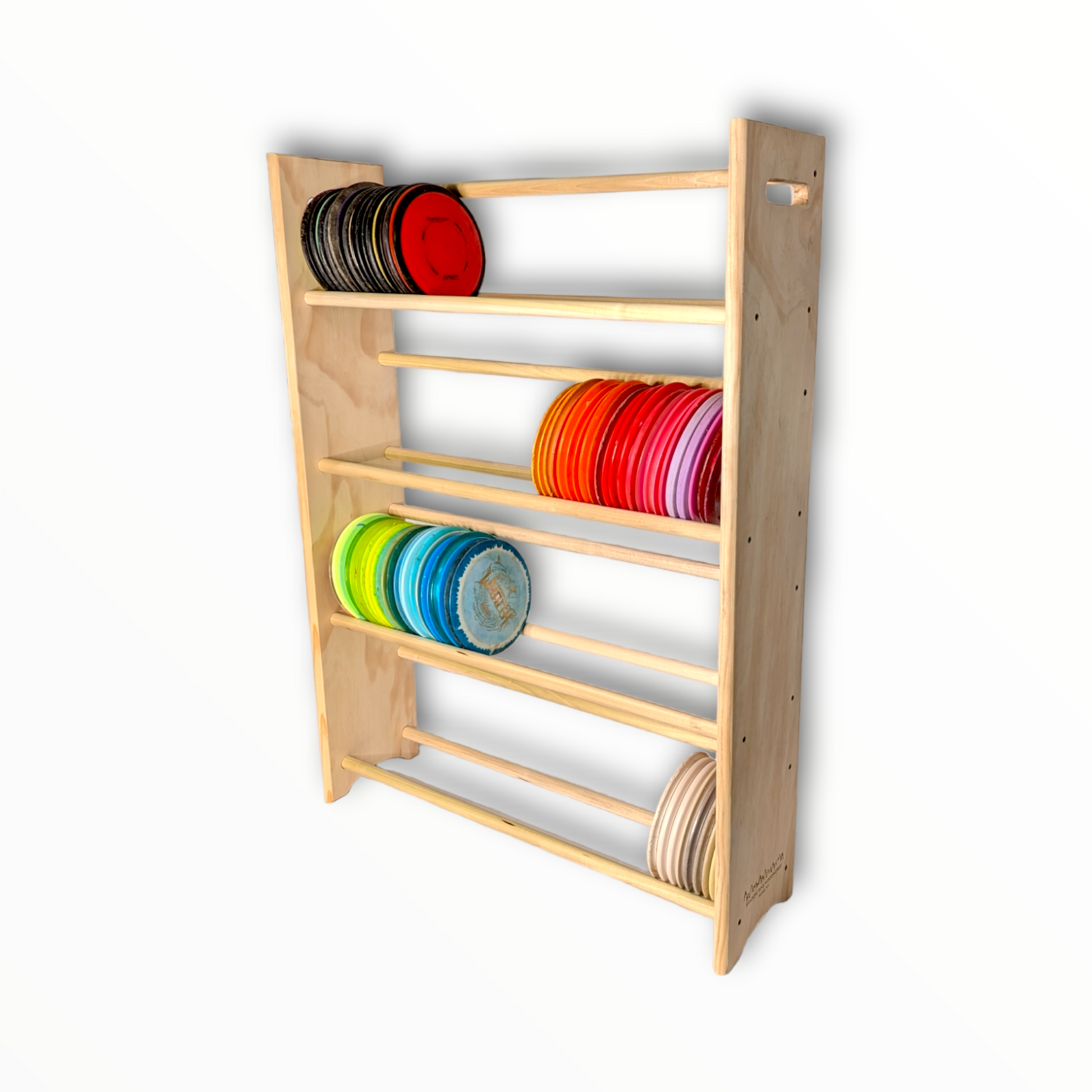 These hand-made disc golf racks are perfect for organizing untamed heaps of plastic. They are built to order (with customization available) and are shipped for free to the US! Storage possibilities are anywhere from 15 discs all the way up to over 240 discs, depending on the size chosen.