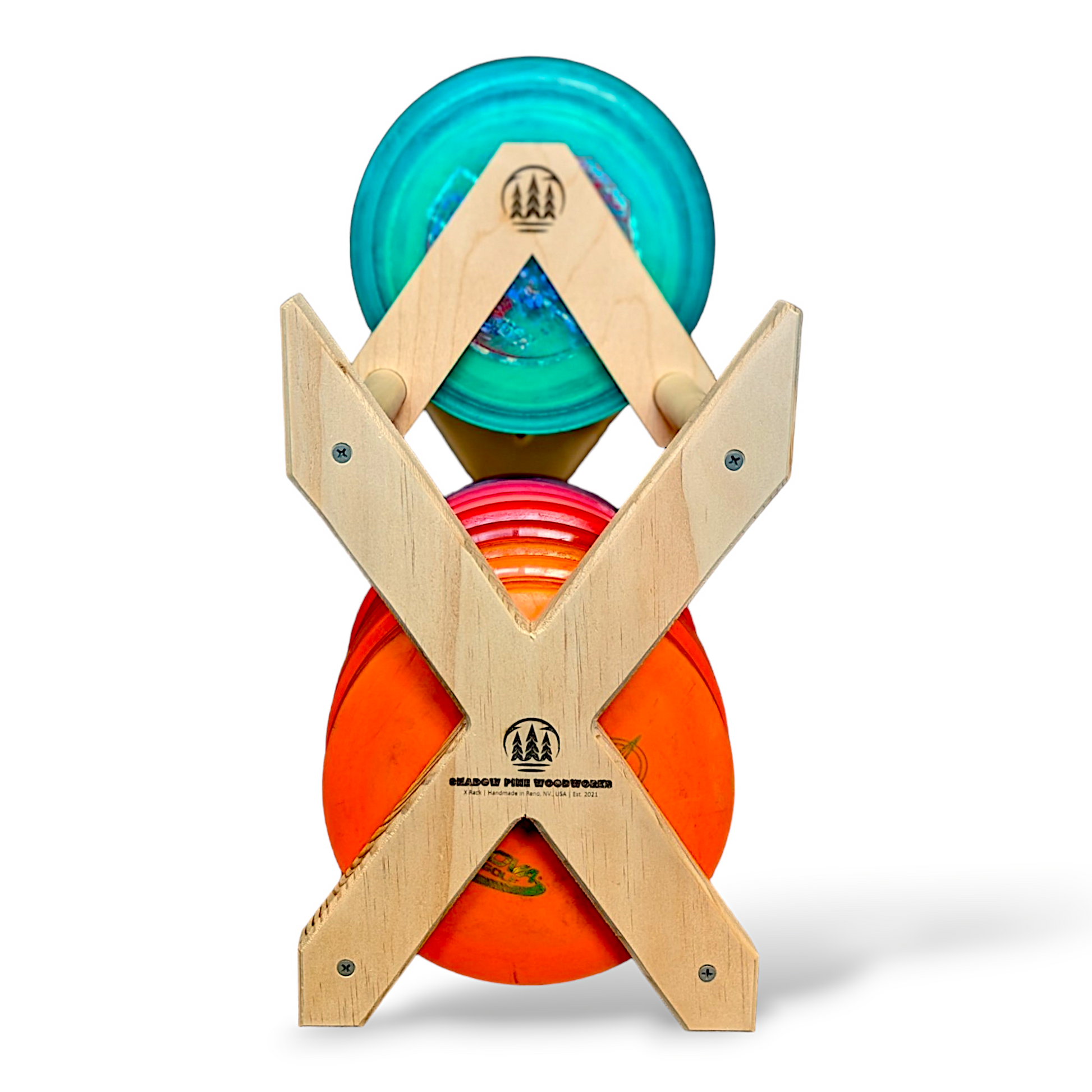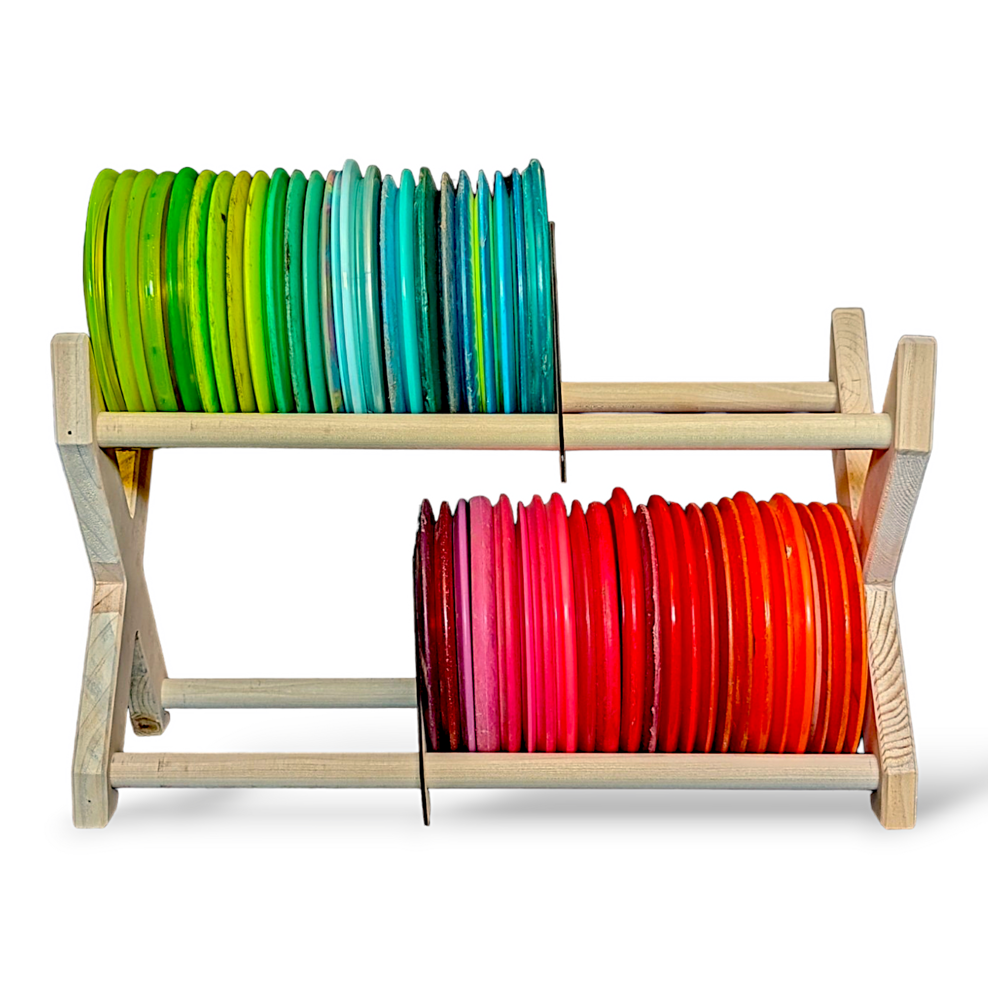 Design: All racks have beveled edges to ensure comfort when touching or moving the racks. They are built with 1" thick pine to ensure stability. Discs are nestled within two 1" dowels and each level comes with one disc divider to ensure they won't fall out unless completely tipped over. The racks are sanded to a smooth finish and may be stained/clearcoated if that option is selected.