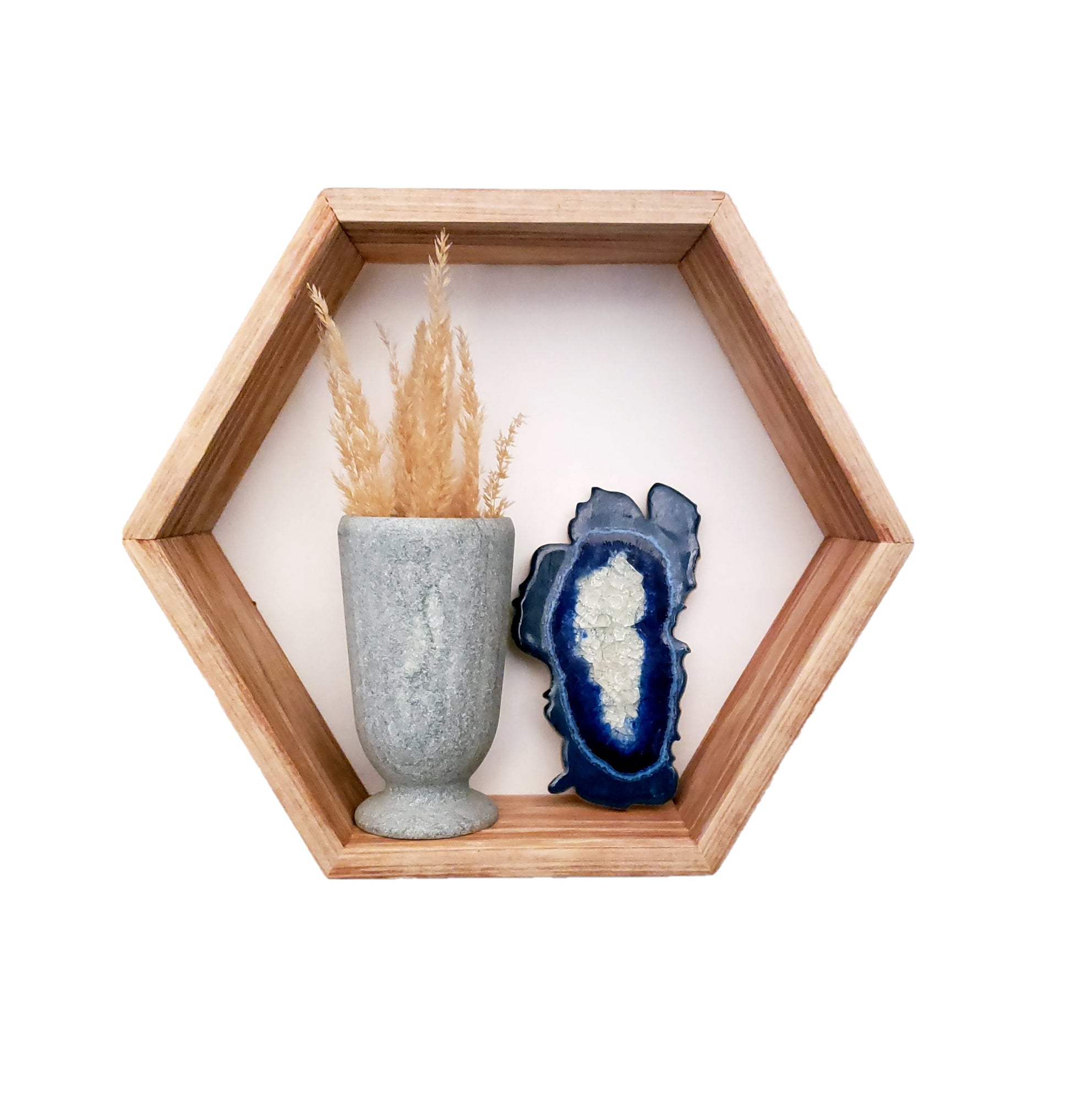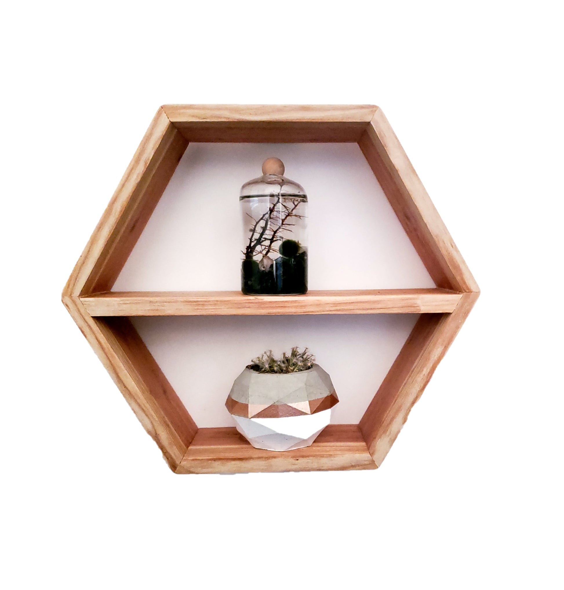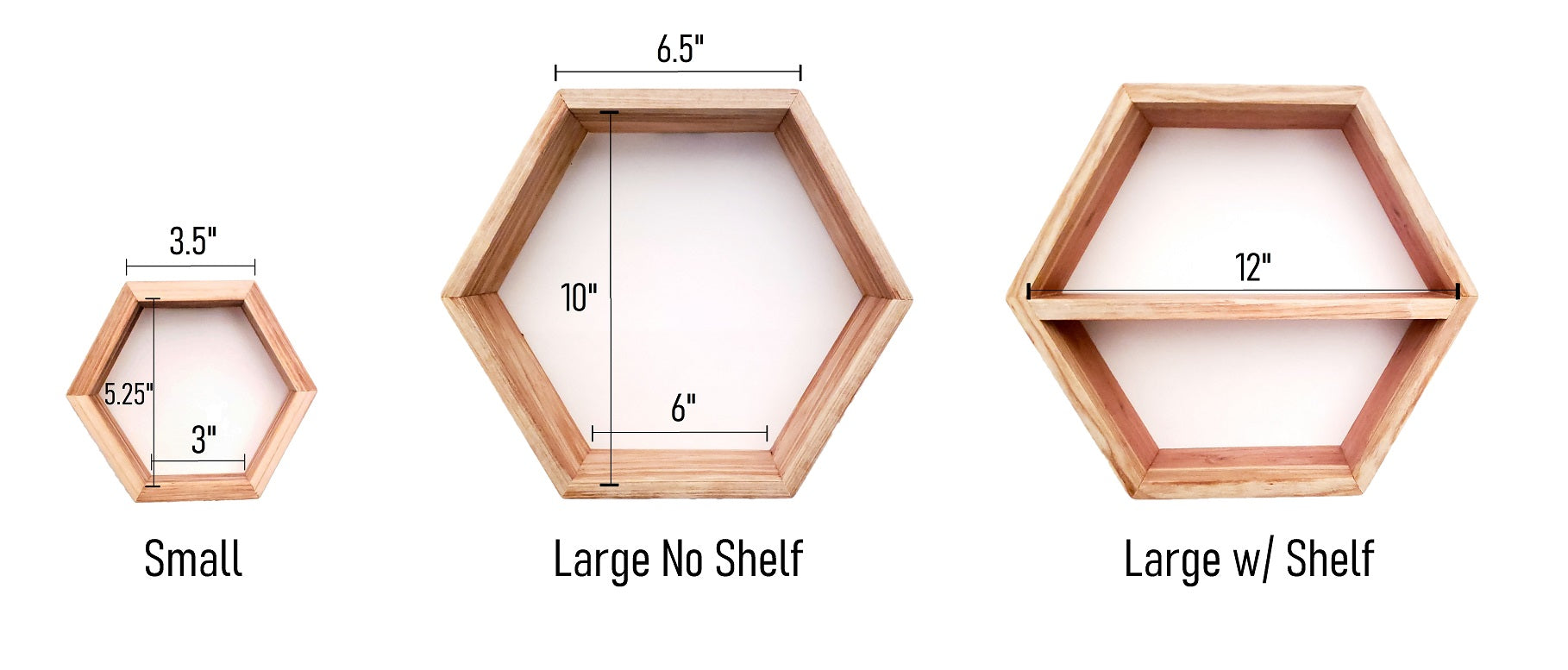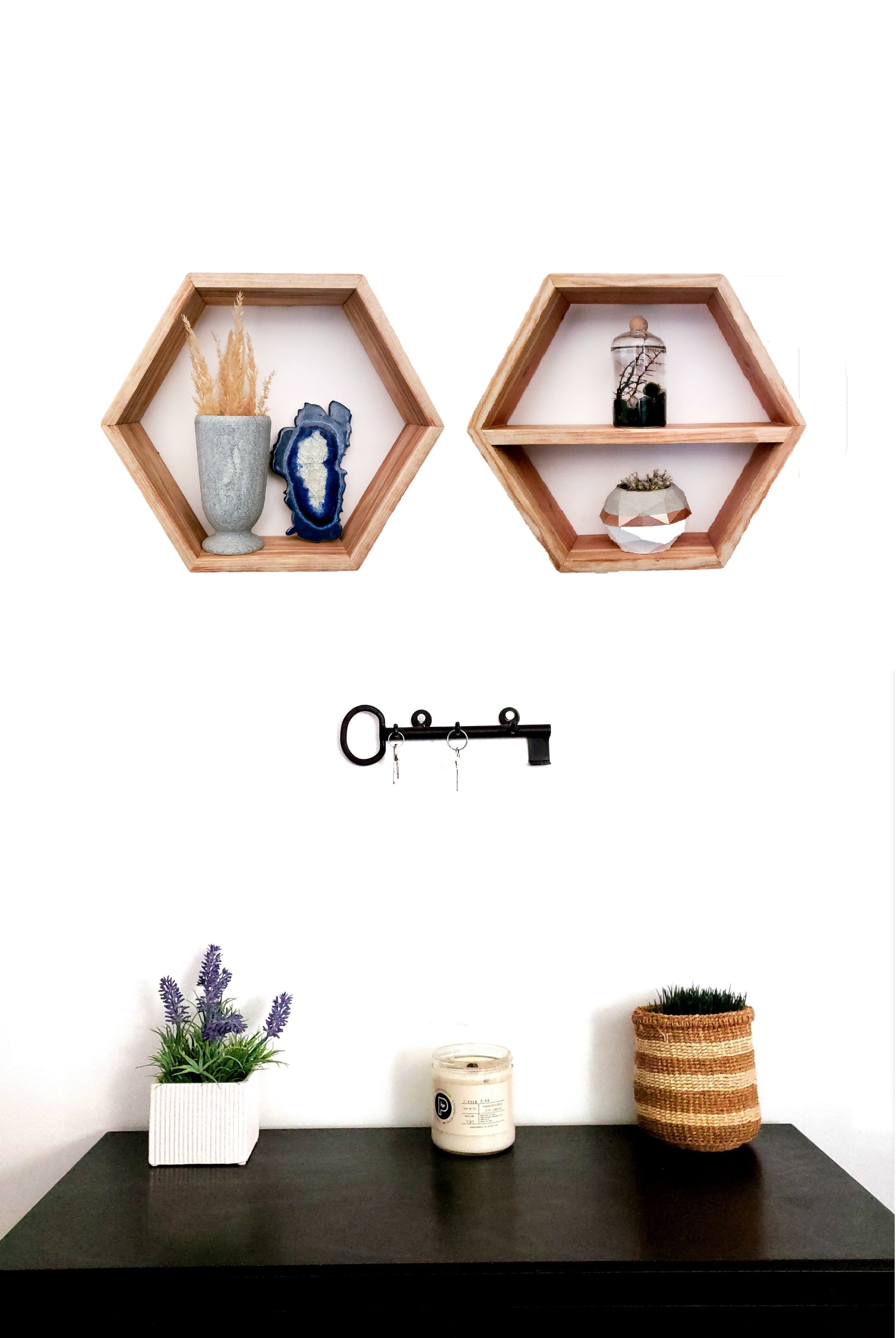 These honeycomb shelves are hand-made from redwood and clear coated to preserve the natural color of the wood. They are easy to hang and can be set up in any pattern you like! They will add dimension and style to almost any room of your home.
