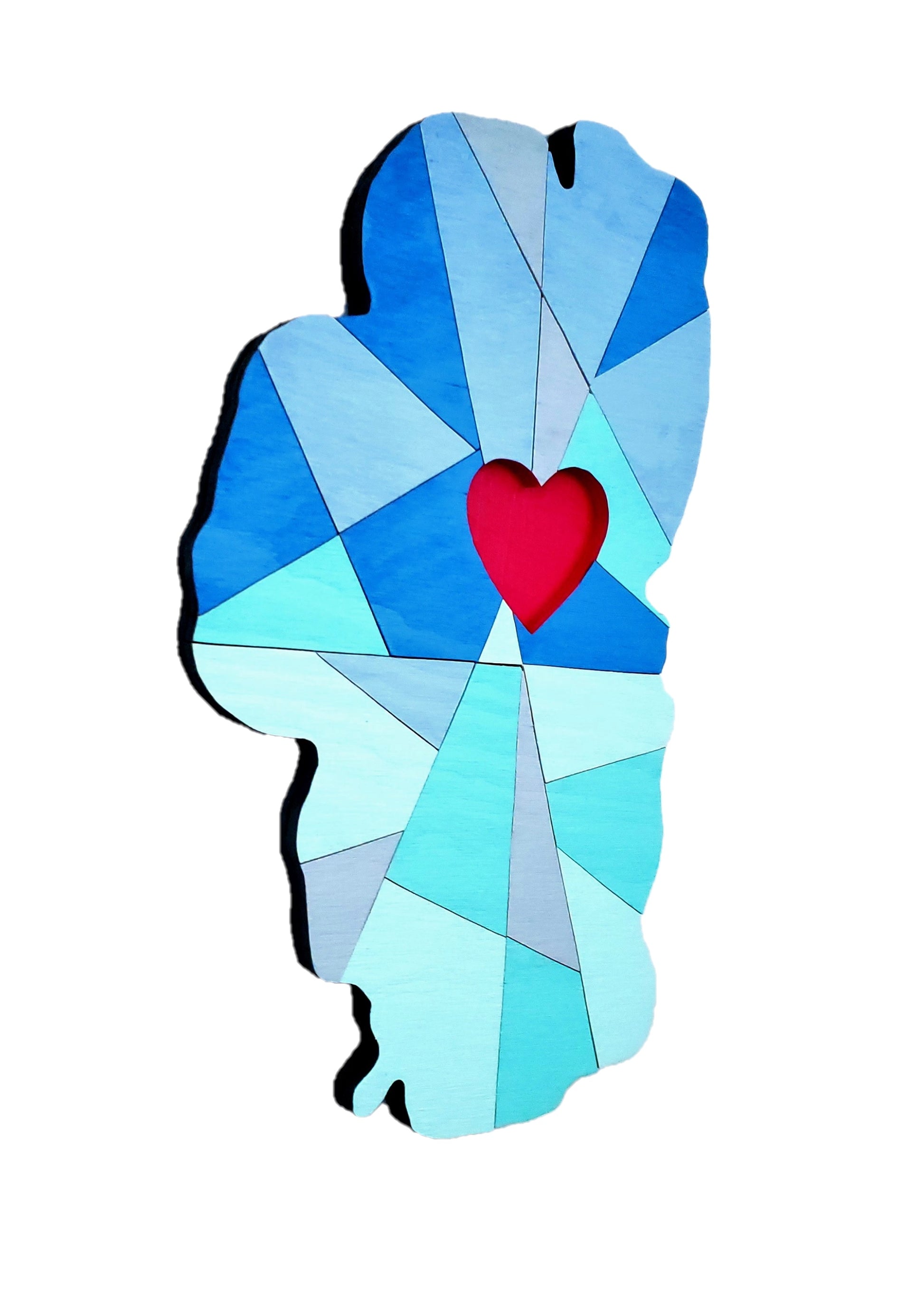 This Lake Tahoe inspired art piece is constructed with 2 layer of wood cut into a geometric shape with a recessed heart in the center. This wall hang is a perfect fit for anyone looking to showcase their love for the outdoors, art, and the stunning Lake Tahoe basin.