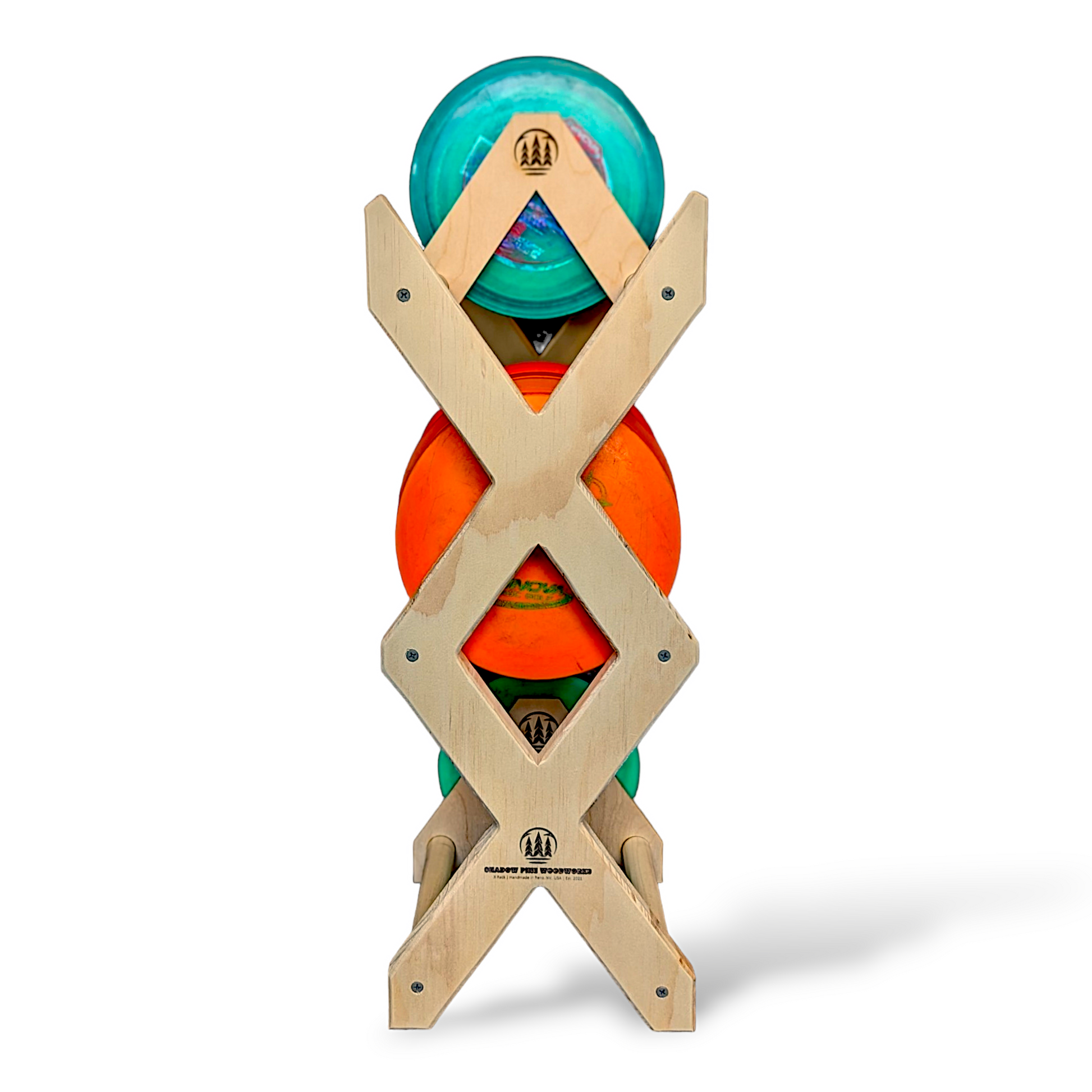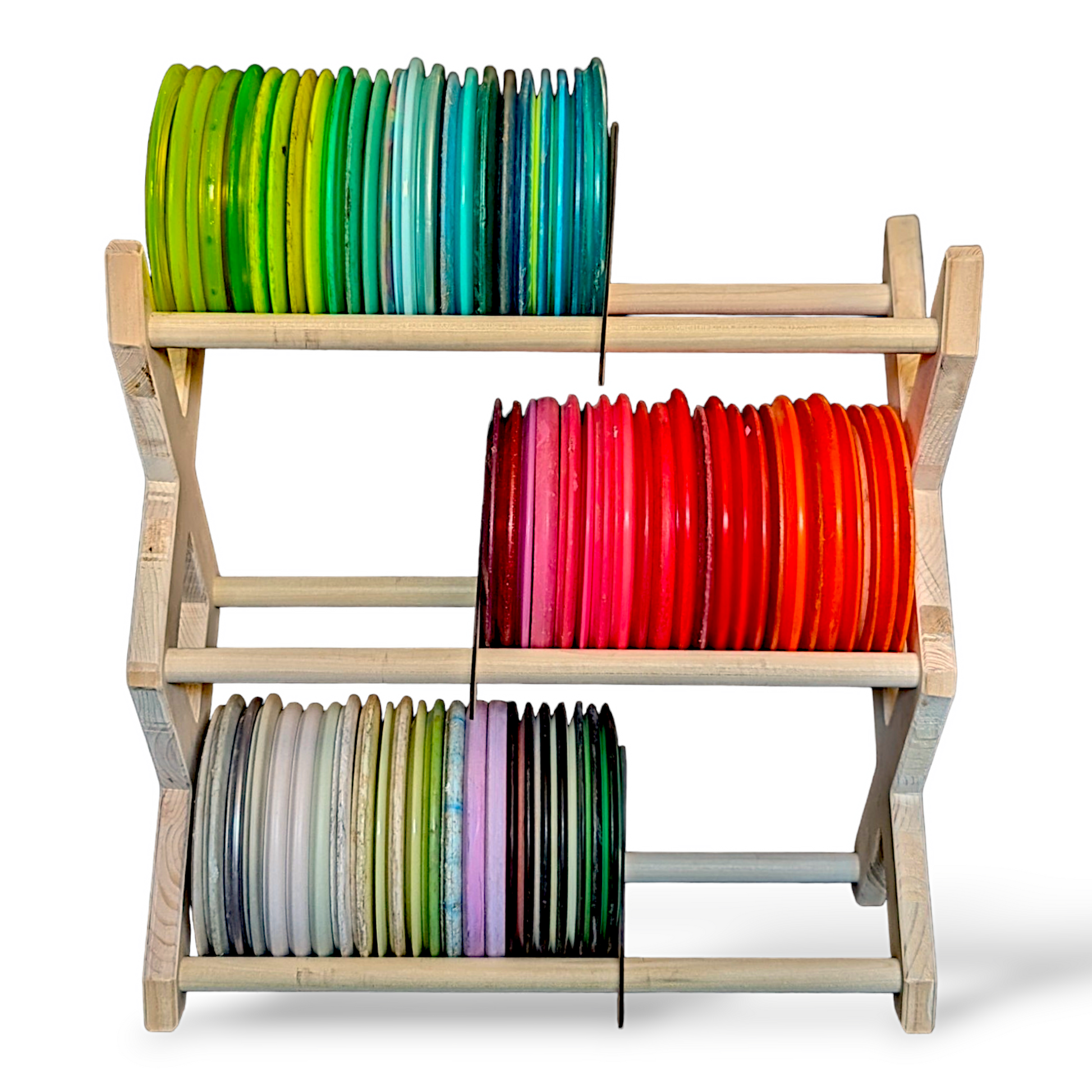 Design: All racks have beveled edges to ensure comfort when touching or moving the racks. They are built with 1" thick pine to ensure stability. Discs are nestled within two 1" dowels and each level comes with one disc divider to ensure they won't fall out unless completely tipped over. The racks are sanded to a smooth finish and may be stained/clearcoated if that option is selected.