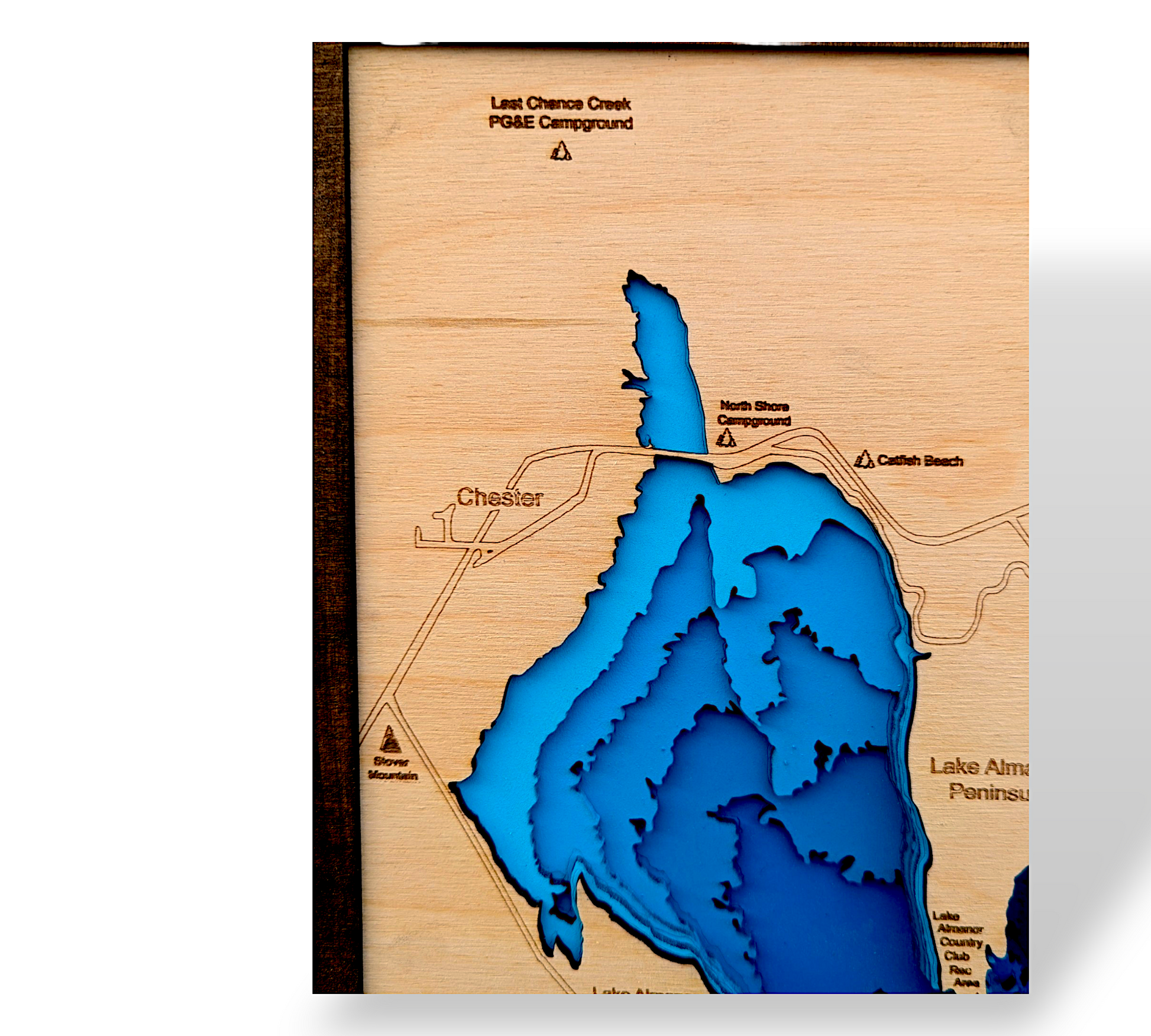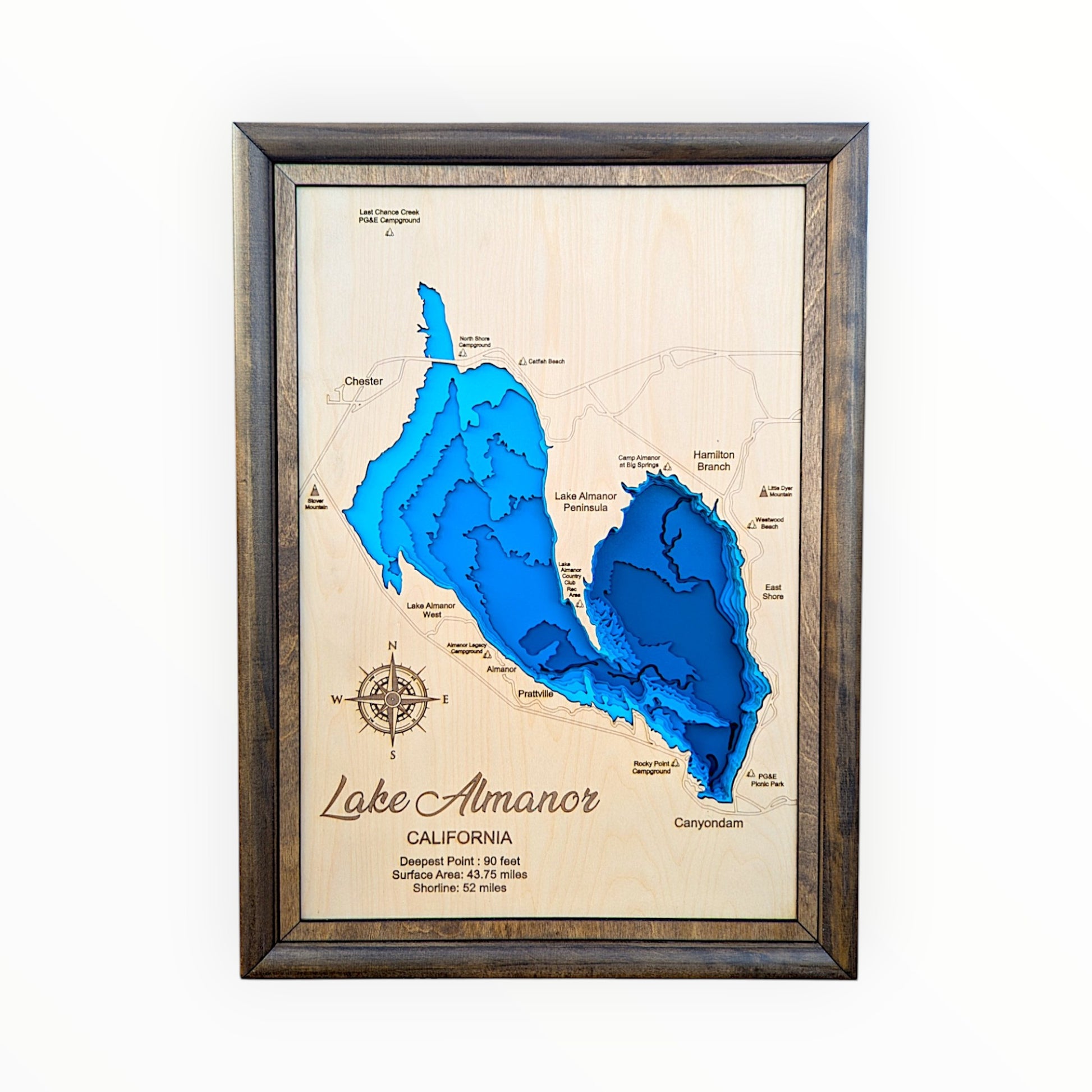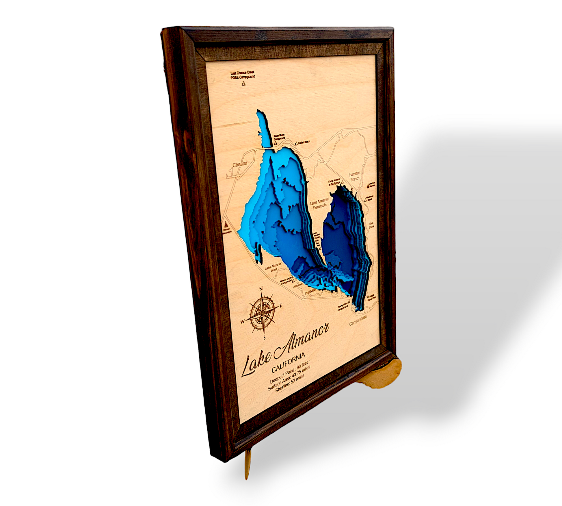 Bring the beauty of Lake Almanor into your home with this stunning bathymetric wood map wall art, a tribute to the tranquil waters and scenic landscapes of Northern California’s beloved lake. Nestled at the base of Mount Lassen, Lake Almanor is known for its sparkling blue waters, abundant recreational opportunities, and surrounding natural beauty. This bathymetric map beautifully captures the lake’s unique underwater topography, showcasing the lake's depths, submerged ridges, and hidden features beneath the surface.
