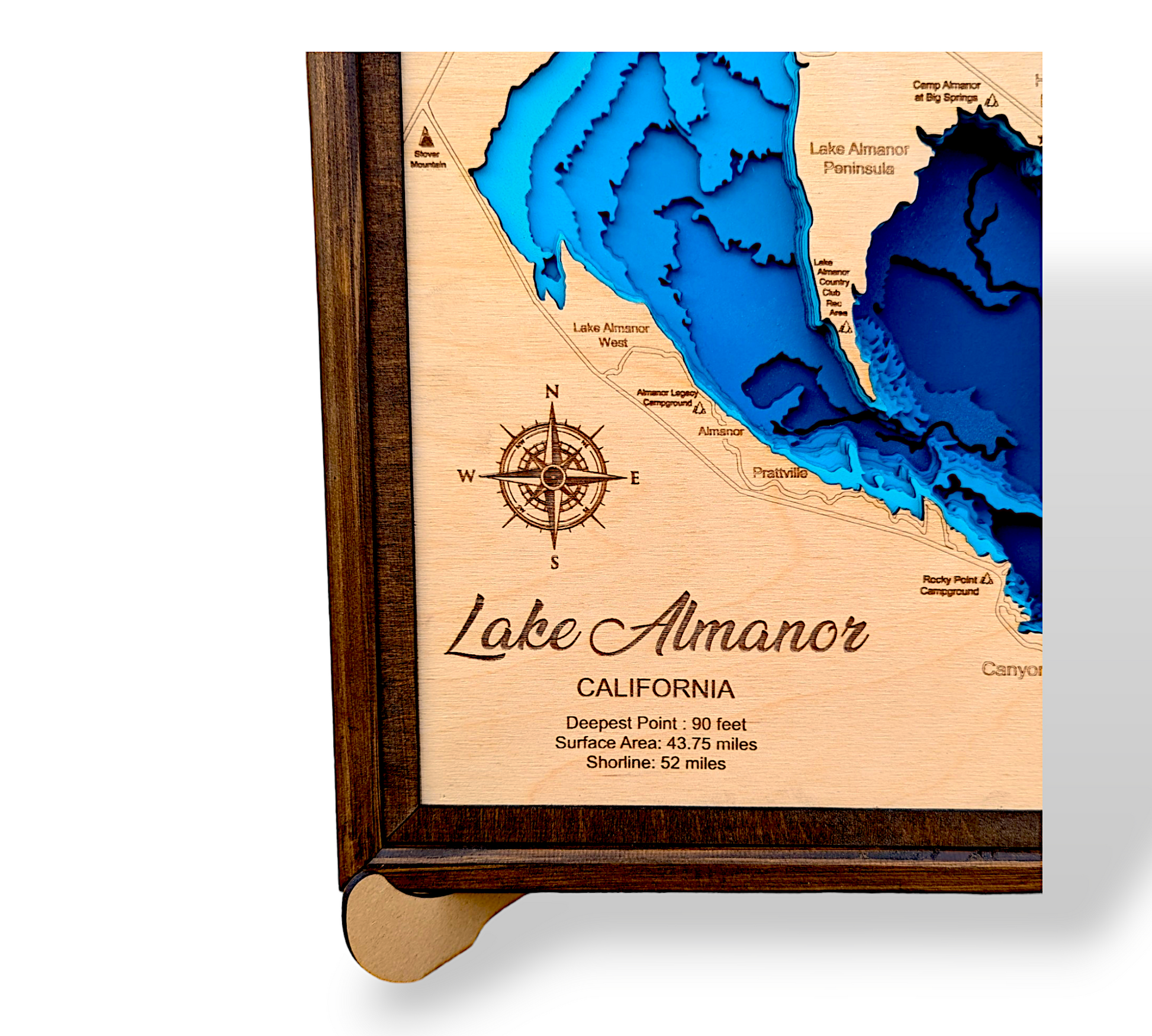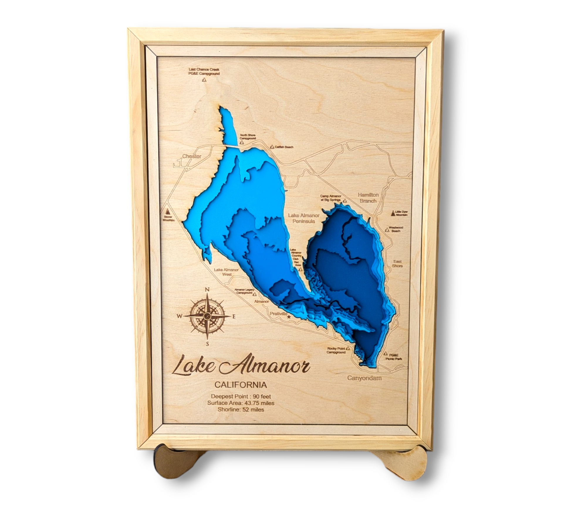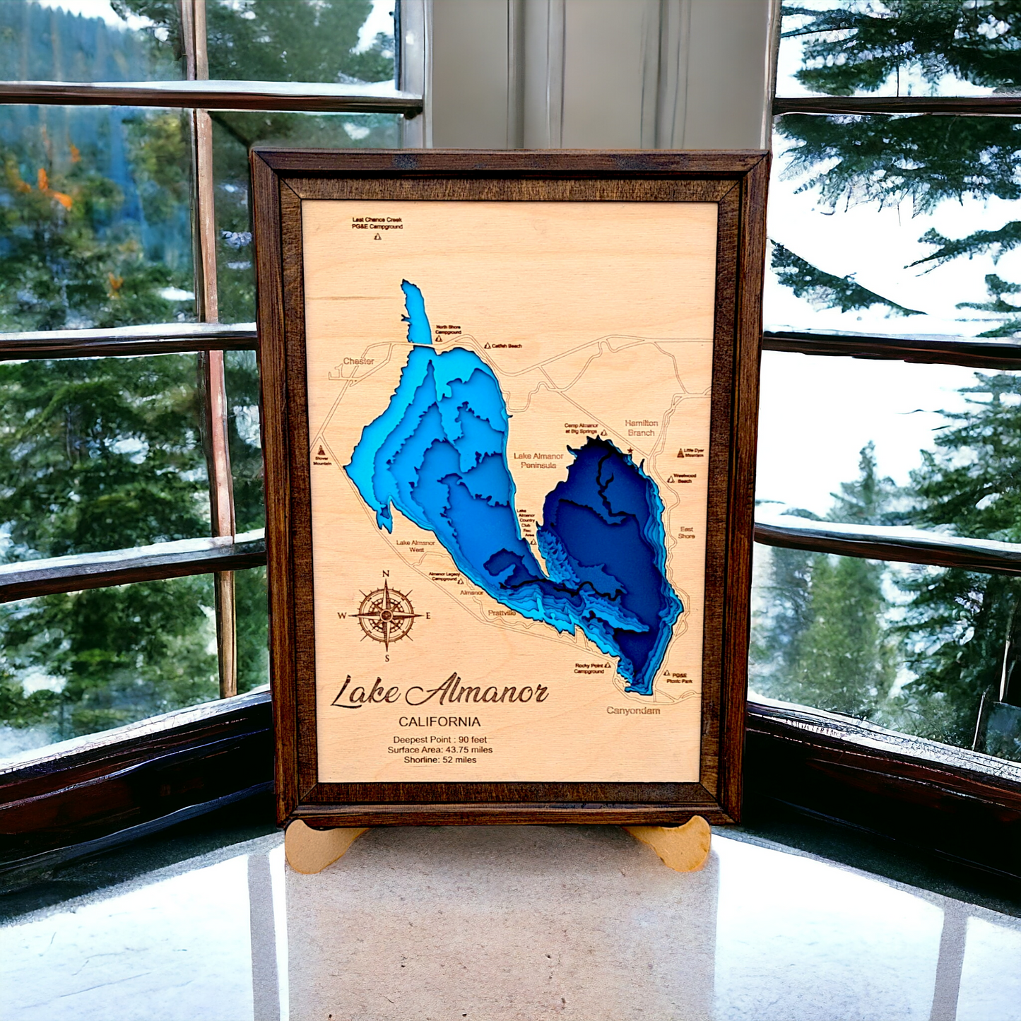 Bring the beauty of Lake Almanor into your home with this stunning bathymetric wood map wall art, a tribute to the tranquil waters and scenic landscapes of Northern California’s beloved lake. Nestled at the base of Mount Lassen, Lake Almanor is known for its sparkling blue waters, abundant recreational opportunities, and surrounding natural beauty. This bathymetric map beautifully captures the lake’s unique underwater topography, showcasing the lake's depths, submerged ridges, and hidden features beneath the surface.