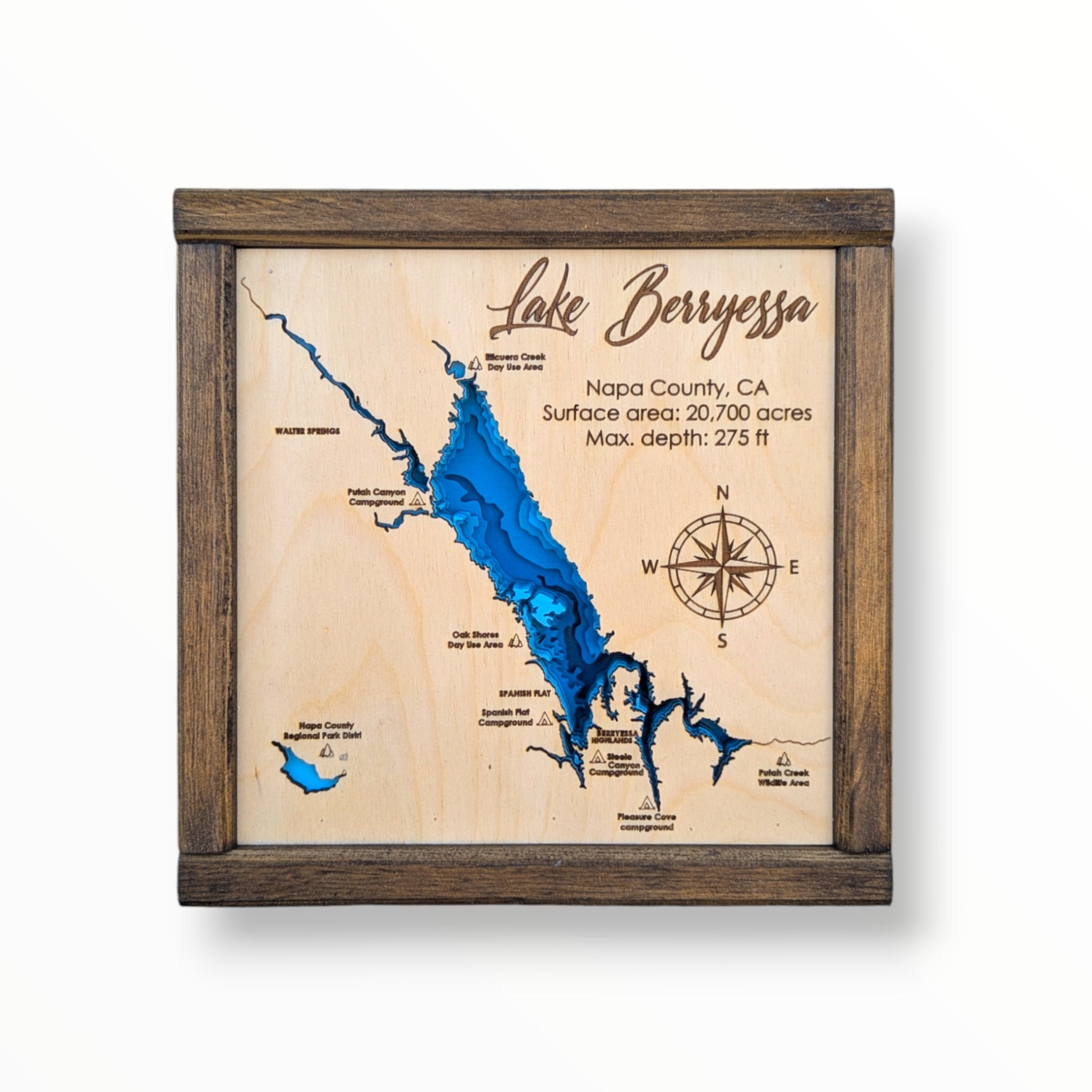 Celebrate the expansive beauty of Lake Berryessa with this intricately laser-cut wood bathymetry map. Nestled in the picturesque Napa Valley, Lake Berryessa is a beloved destination for outdoor enthusiasts, and this map beautifully captures its unique underwater terrain in stunning detail.
