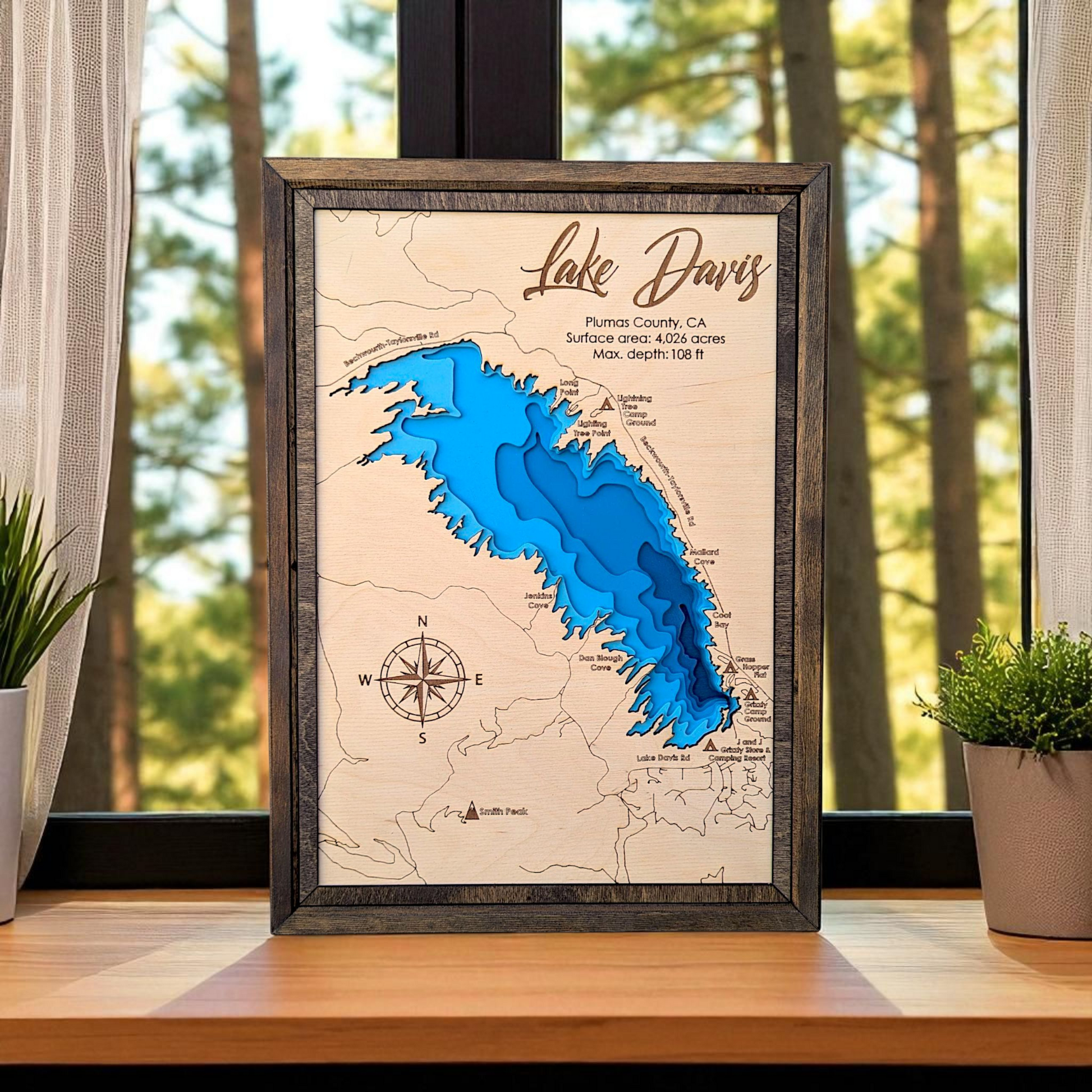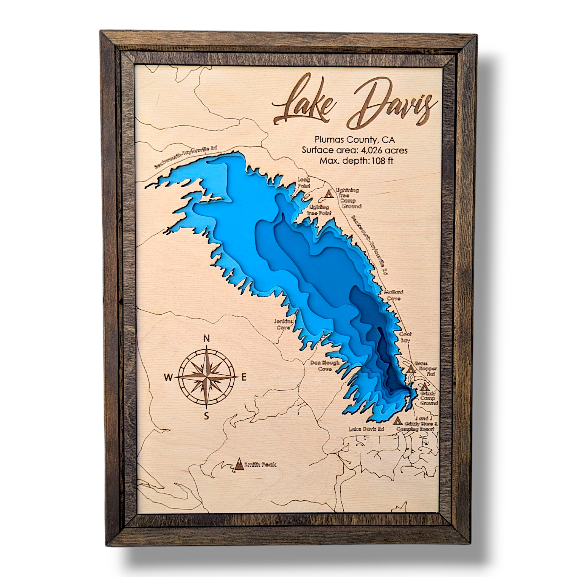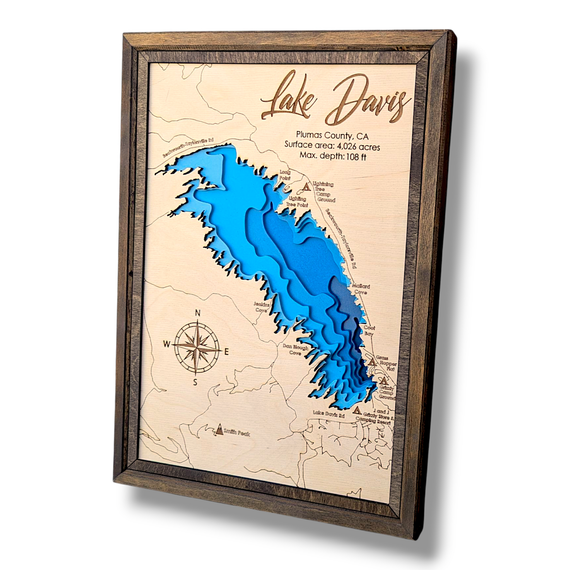 Celebrate the charm of Lake Davis, California, with this intricately laser-cut wood bathymetry map. Nestled in the serene Sierra Nevada mountains near Portola, Lake Davis is cherished for its tranquil waters, abundant wildlife, and recreational opportunities like fishing and hiking. This map elegantly showcases the lake’s unique underwater contours and natural wonder.