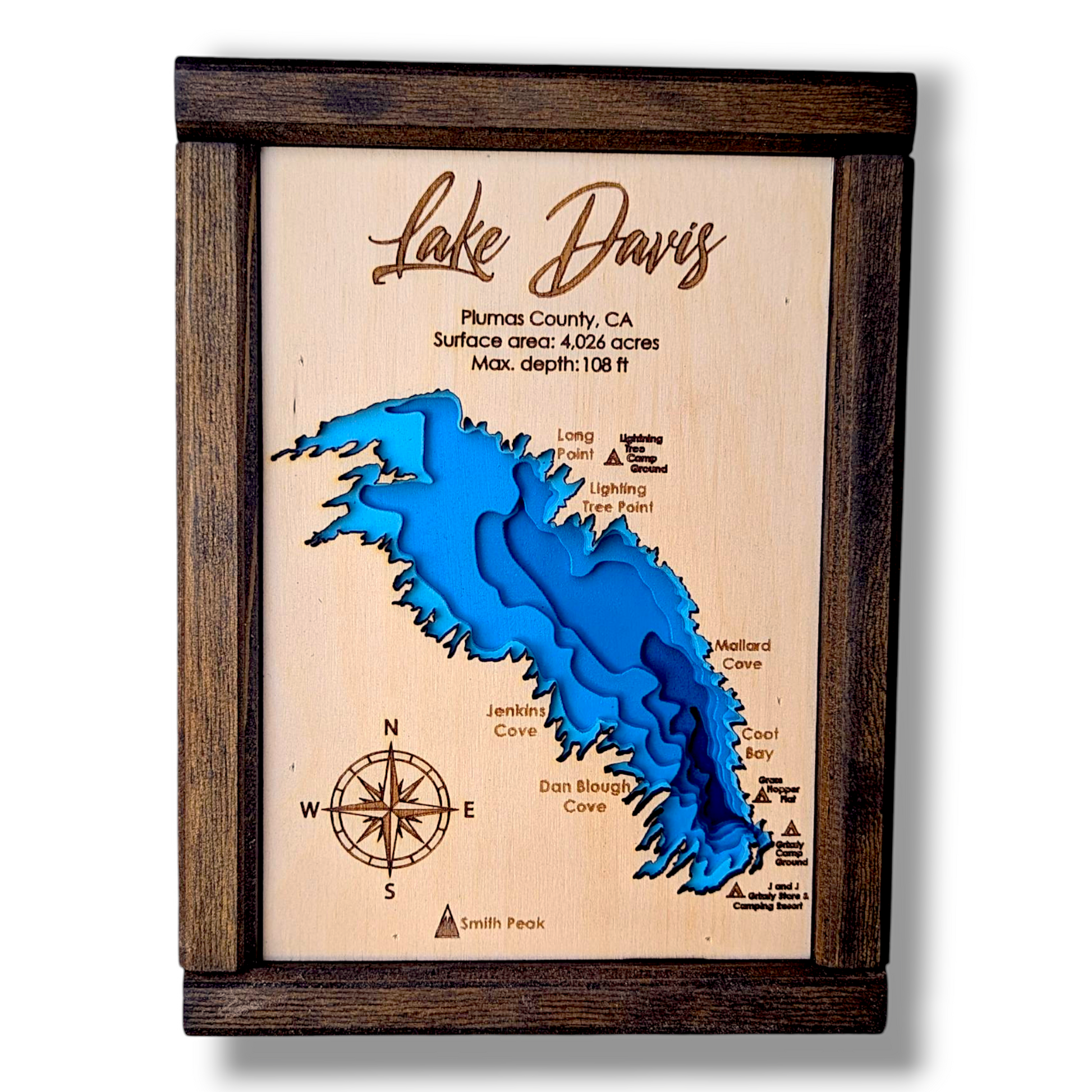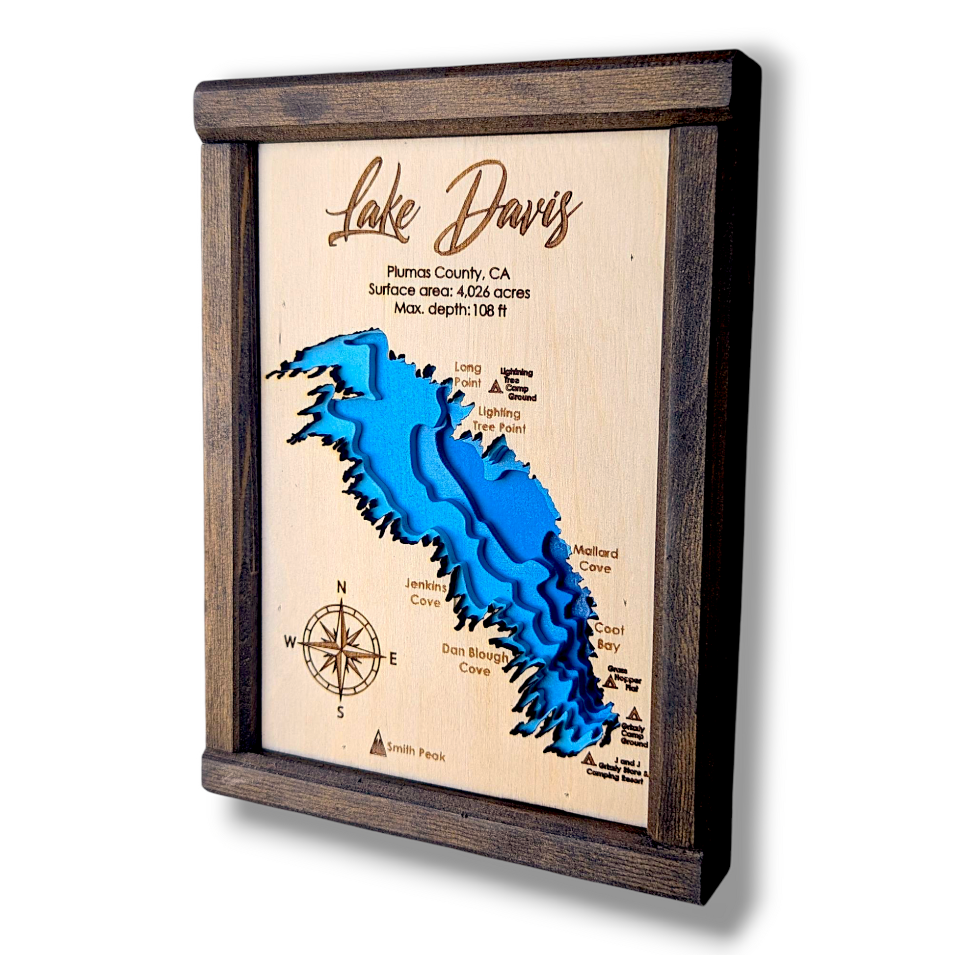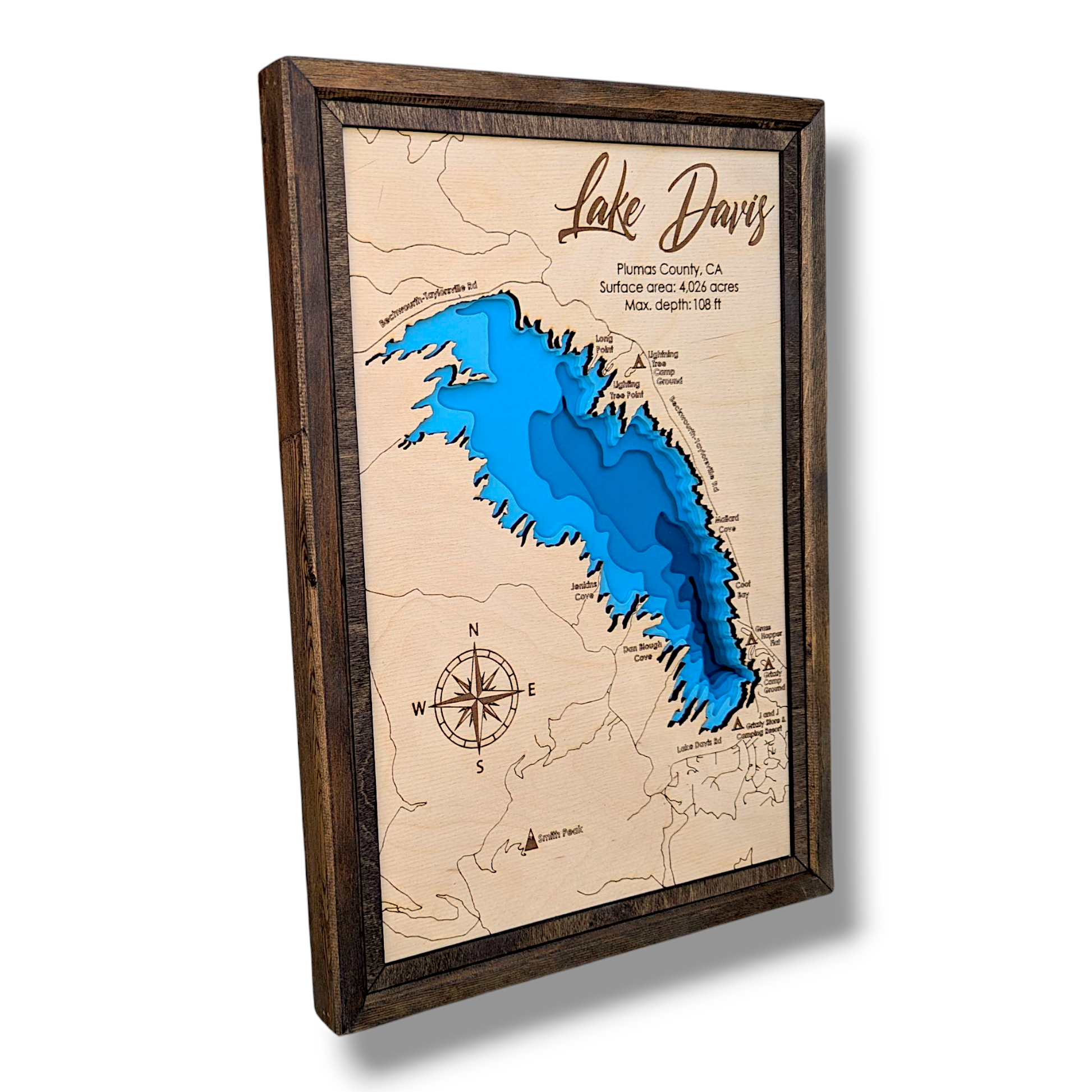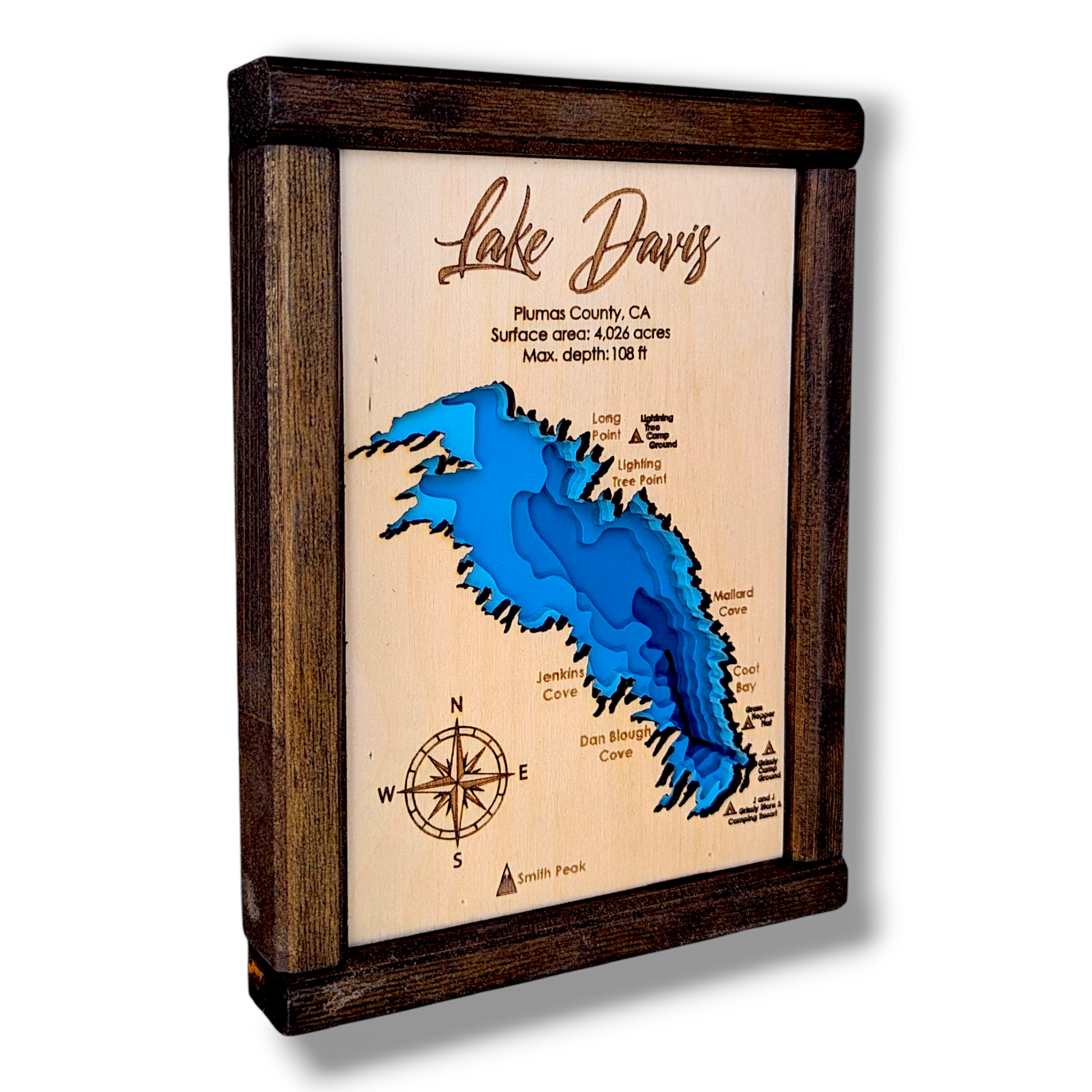 Celebrate the charm of Lake Davis, California, with this intricately laser-cut wood bathymetry map. Nestled in the serene Sierra Nevada mountains near Portola, Lake Davis is cherished for its tranquil waters, abundant wildlife, and recreational opportunities like fishing and hiking. This map elegantly showcases the lake’s unique underwater contours and natural wonder.