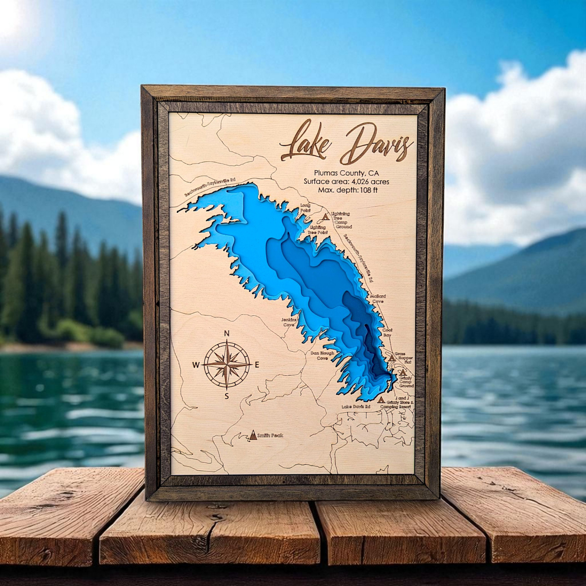 Precision Laser Cutting: Crafted from eco-friendly, high-quality wood, this map highlights Lake Davis’s intricate bathymetric details with exceptional precision.