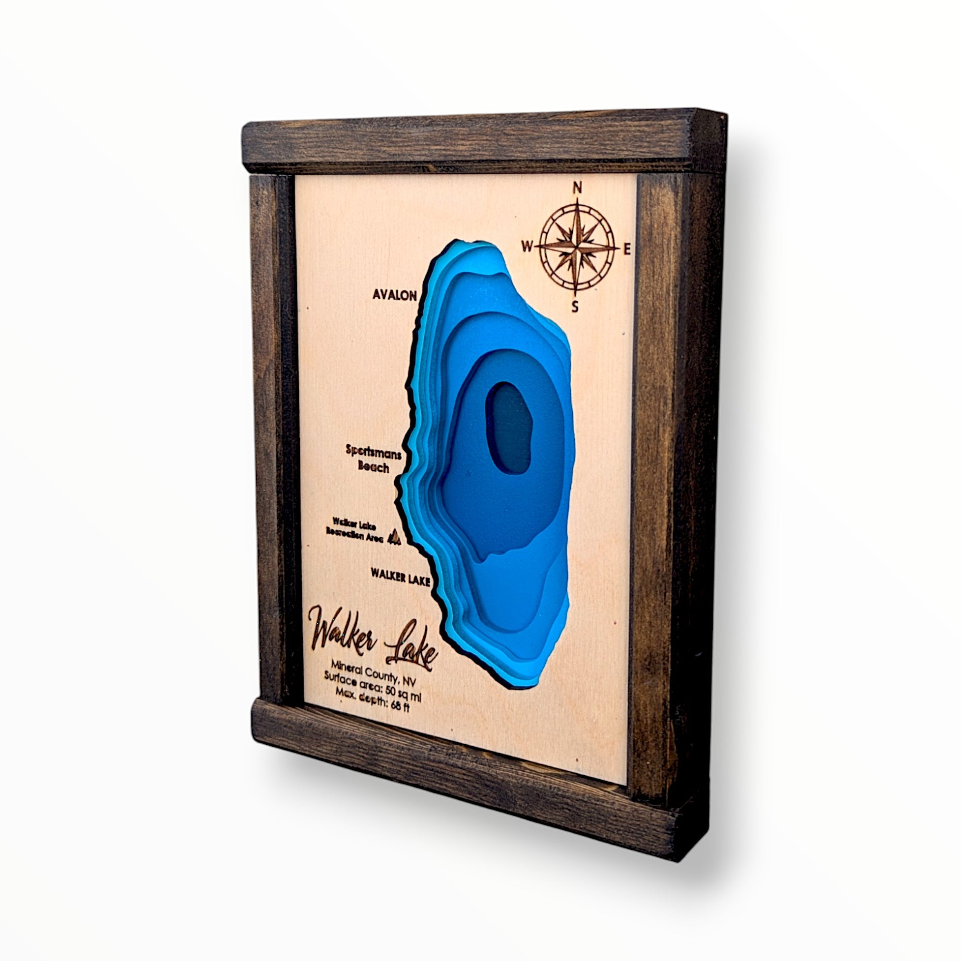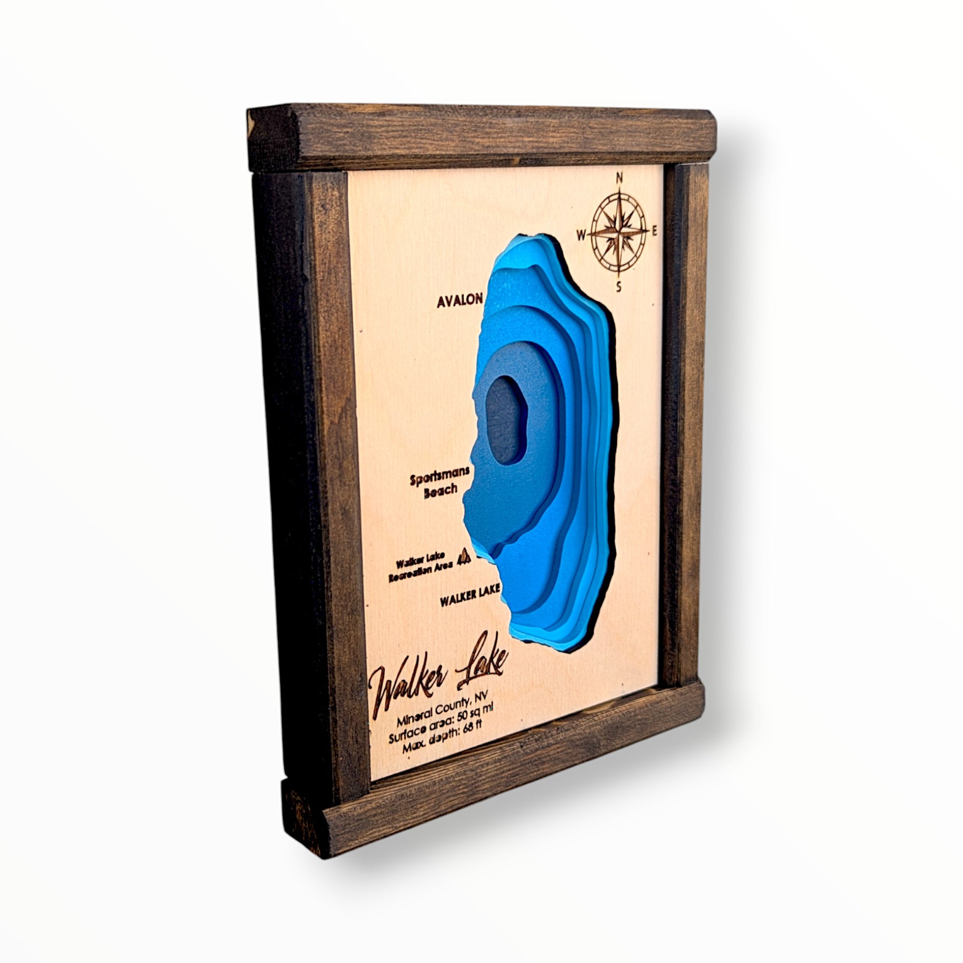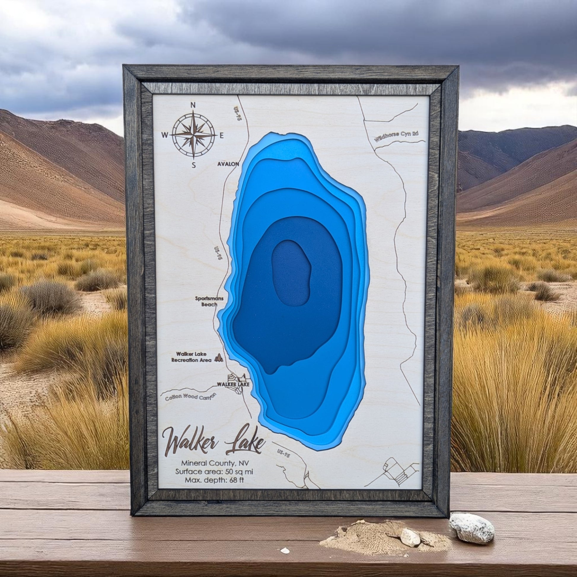 Celebrate the striking landscape of Walker Lake, Nevada, with this intricately laser-cut wood bathymetry map. Nestled in the high desert of Mineral County, Walker Lake is a rare remnant of ancient Lake Lahontan, offering breathtaking views, rich history, and a haven for outdoor enthusiasts. This map elegantly showcases the lake’s unique underwater contours and natural wonder.