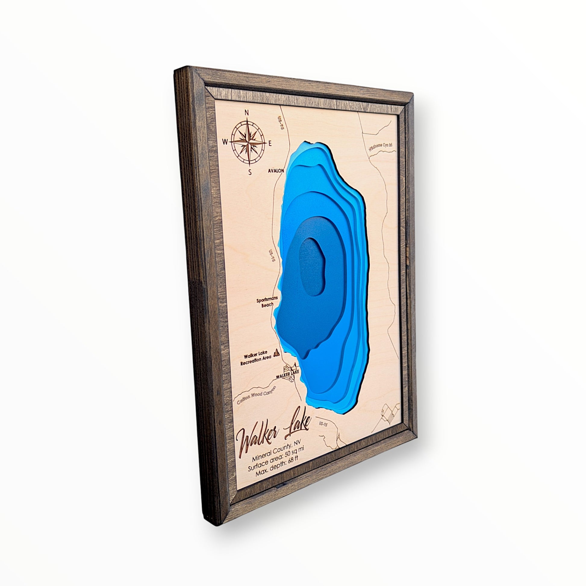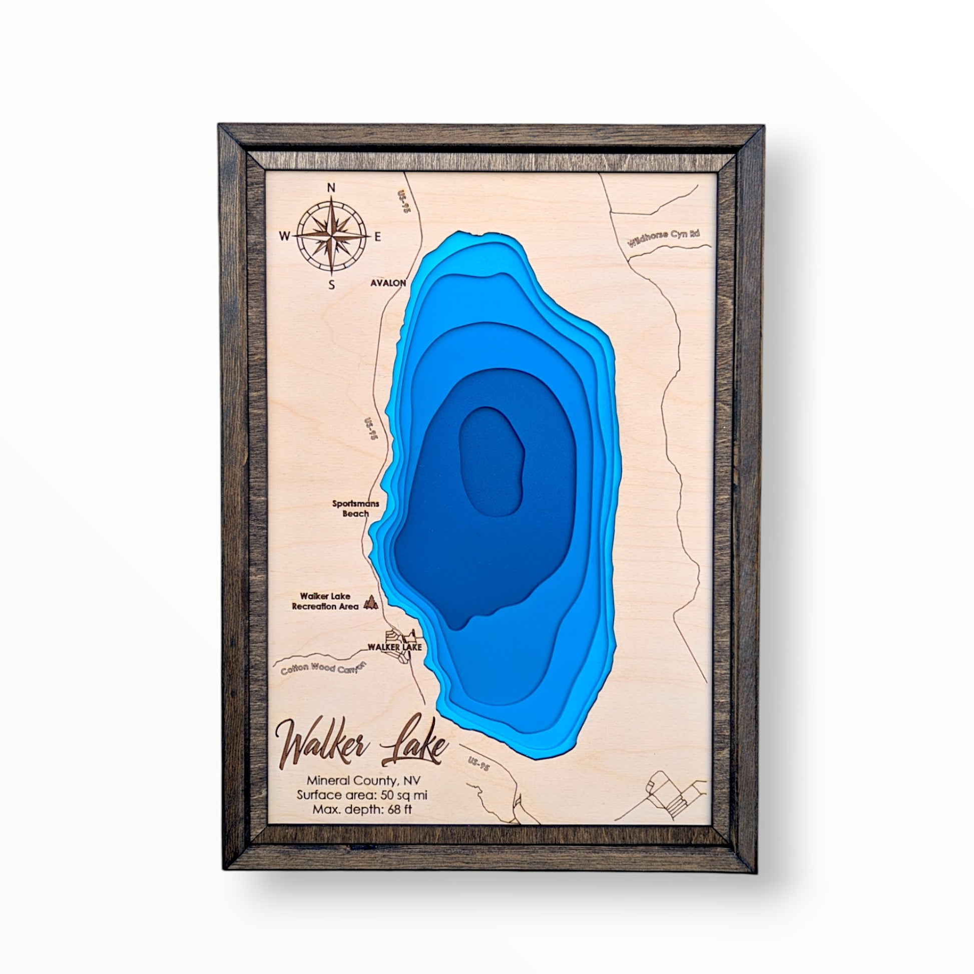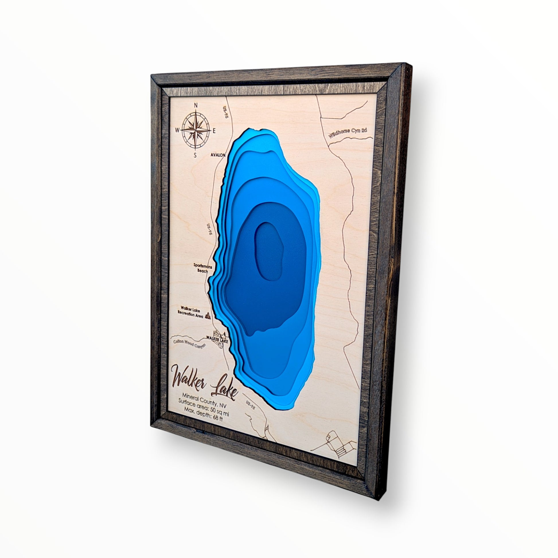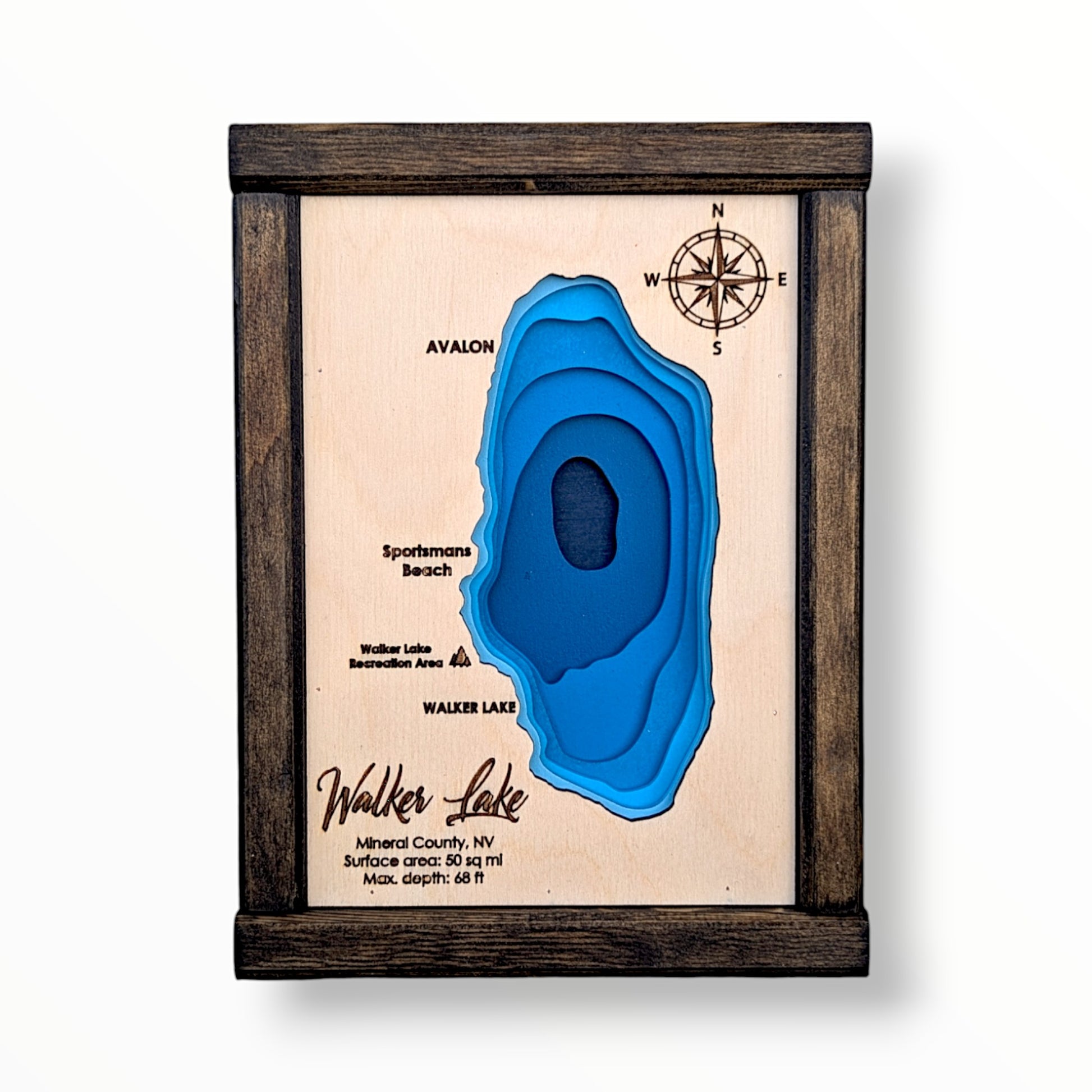 Celebrate the striking landscape of Walker Lake, Nevada, with this intricately laser-cut wood bathymetry map. Nestled in the high desert of Mineral County, Walker Lake is a rare remnant of ancient Lake Lahontan, offering breathtaking views, rich history, and a haven for outdoor enthusiasts. This map elegantly showcases the lake’s unique underwater contours and natural wonder.