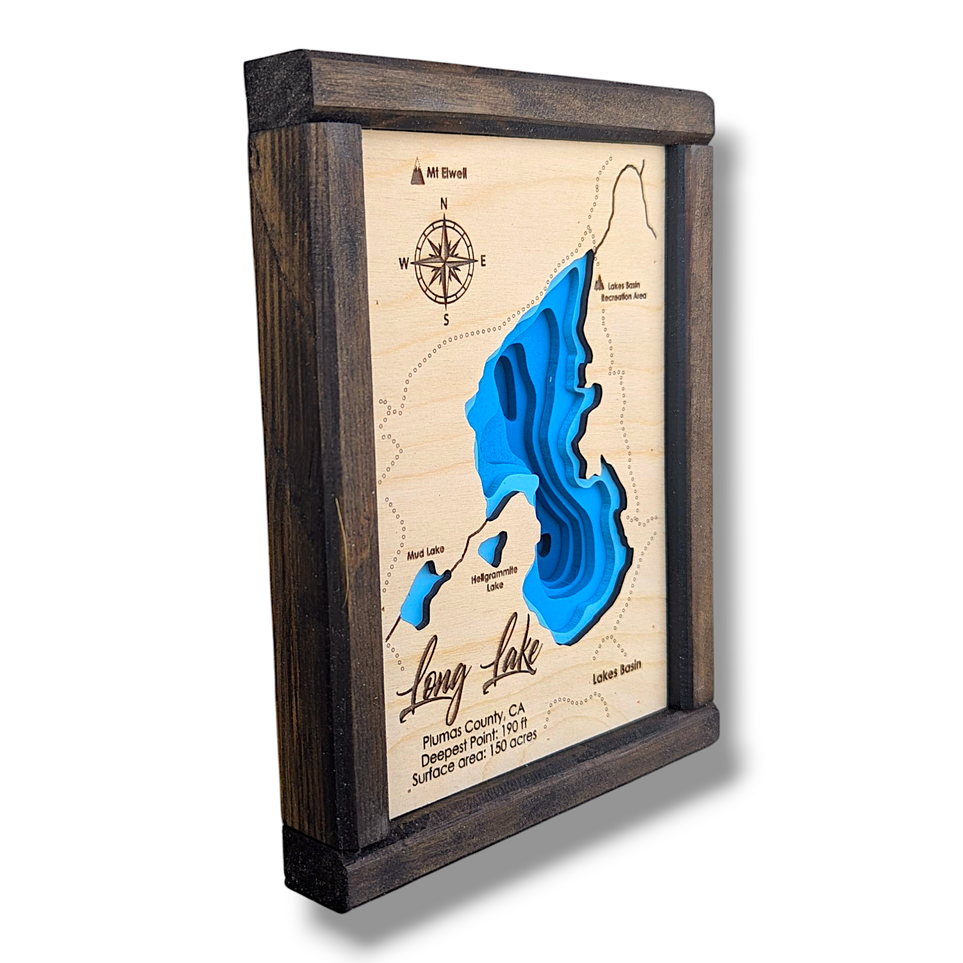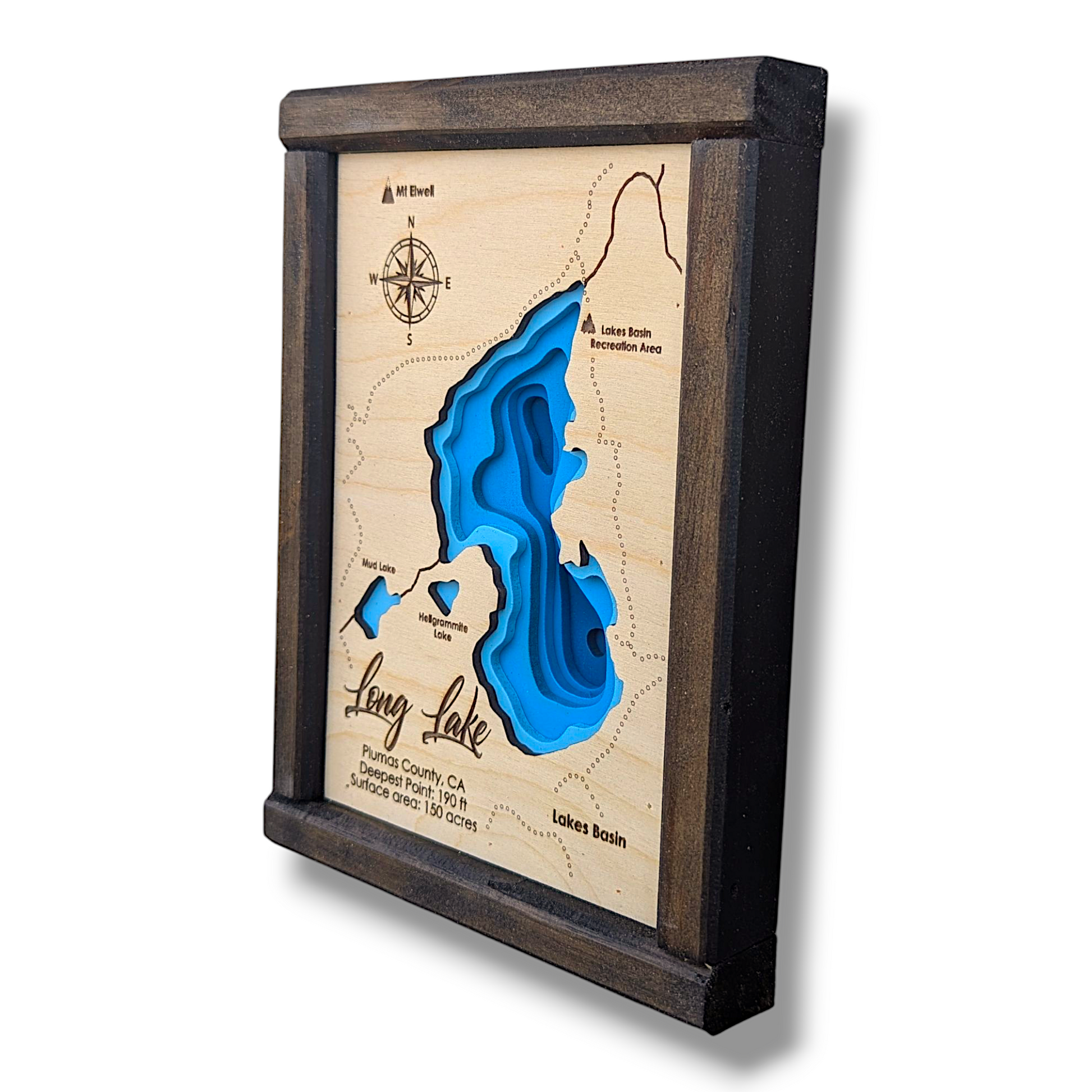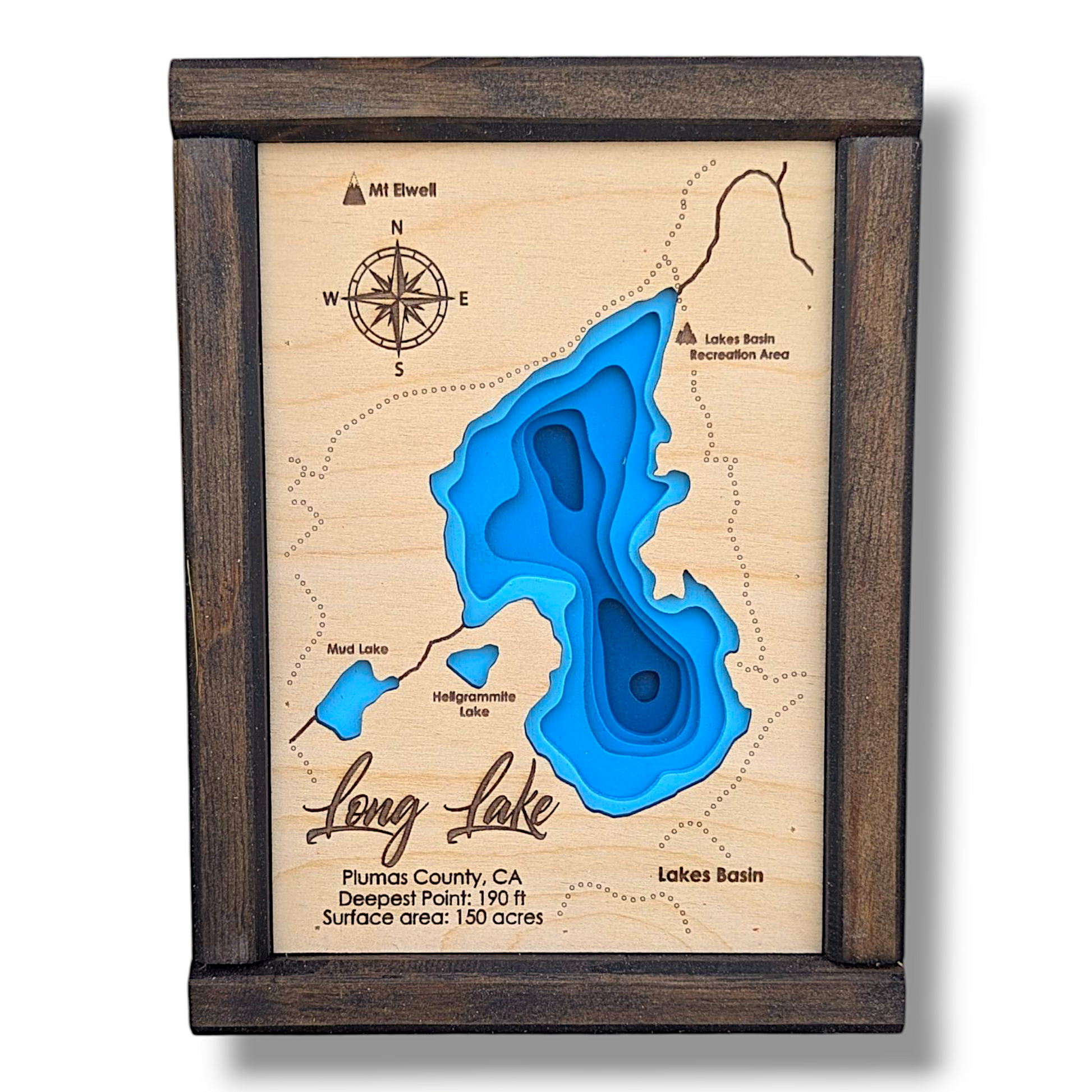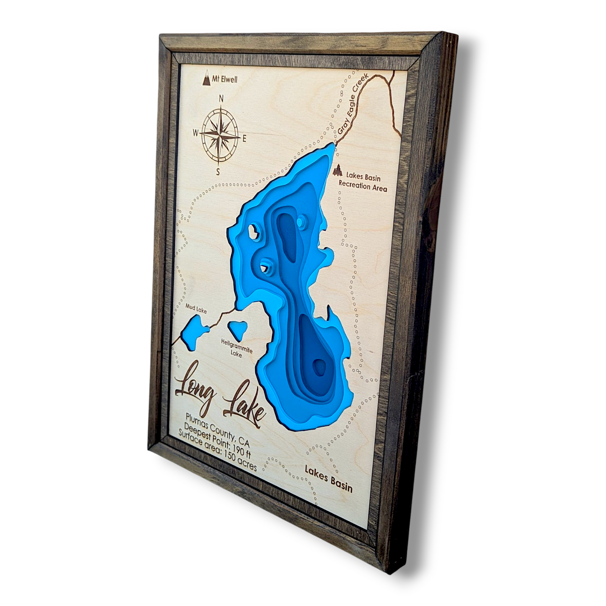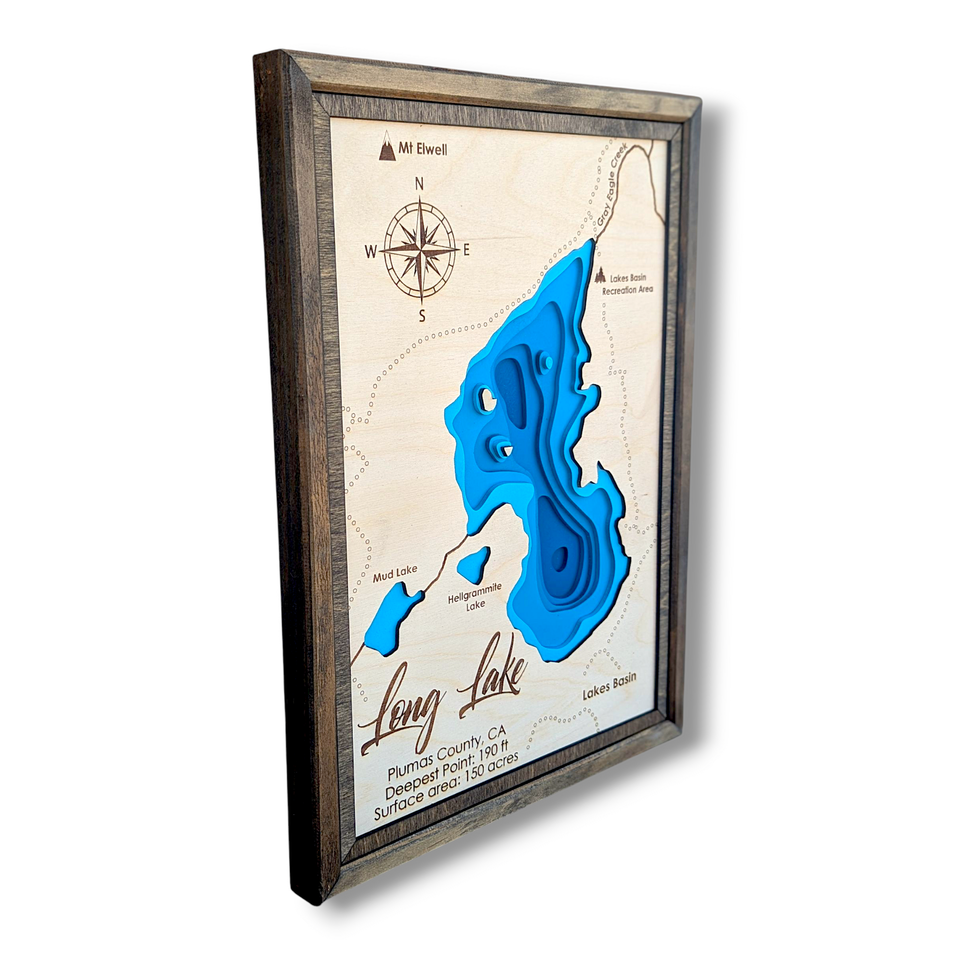 Celebrate the peaceful allure of Long Lake, California, with this finely laser-cut wood bathymetry map. Located in the forested highlands of Plumas County near Graeagle, Long Lake is a hidden gem surrounded by towering pines, granite outcrops, and crisp mountain air. This handcrafted map captures the lake’s serene contours and natural elegance, making it a perfect tribute to this secluded alpine retreat.