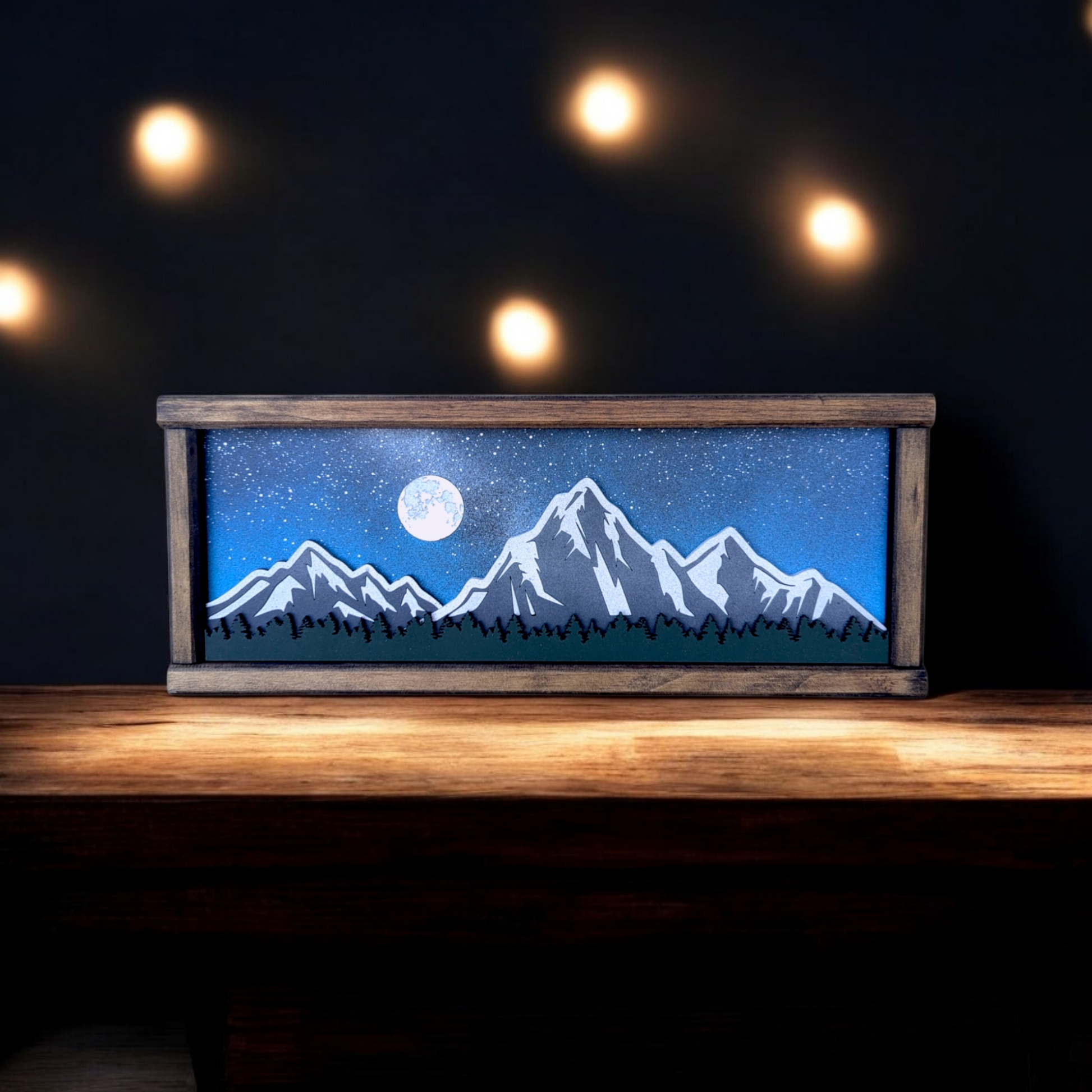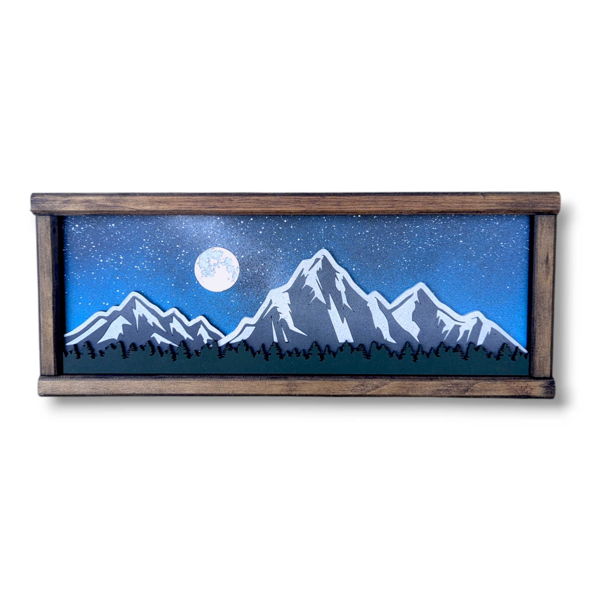 This mountain wood art is constructed with 3 layers of wood painted and stained to create a 3-dimensional recreation of a snowy mountain towering over a forest. This wall hang is a perfect fit for anyone looking to show their love for the mountains, art, and the outdoors.