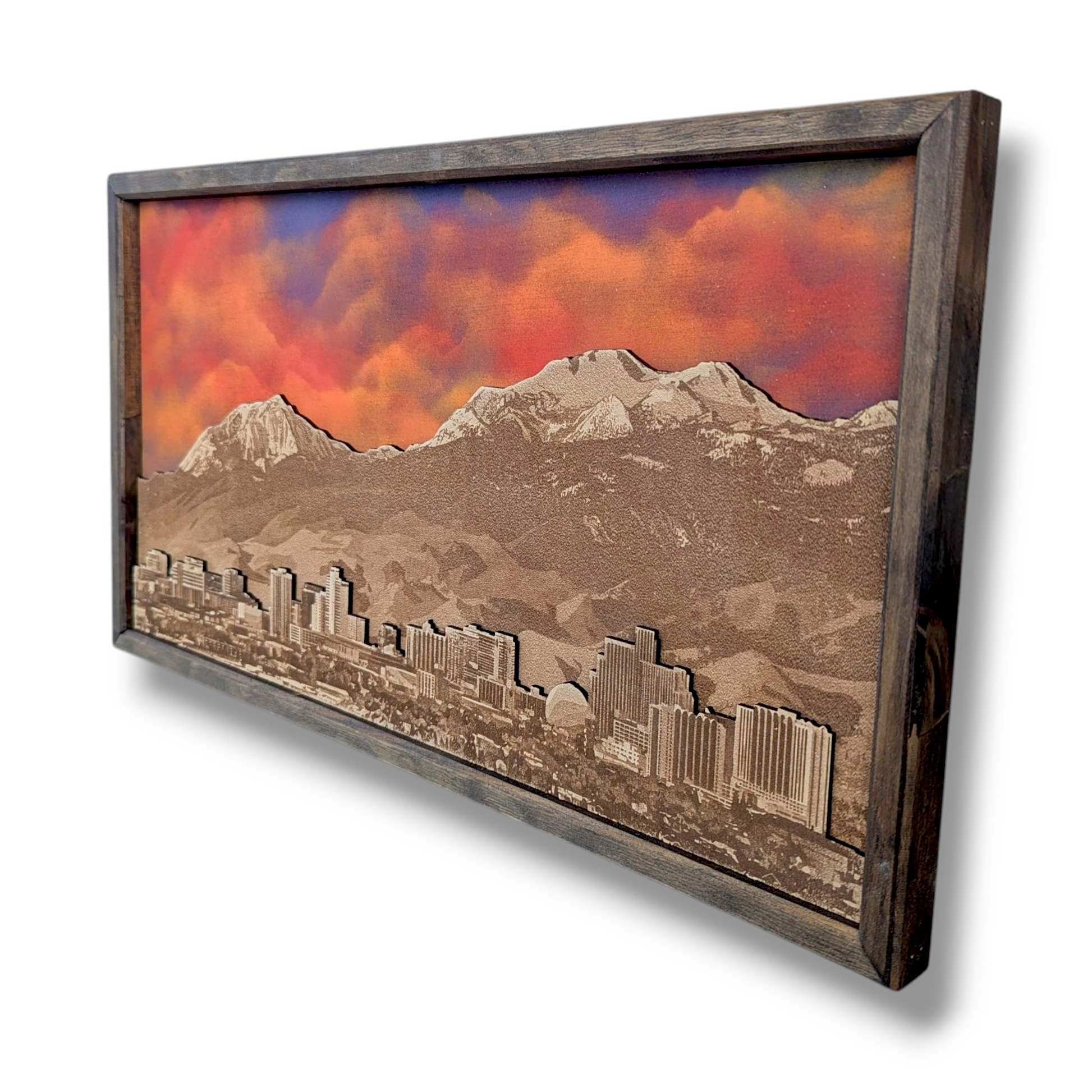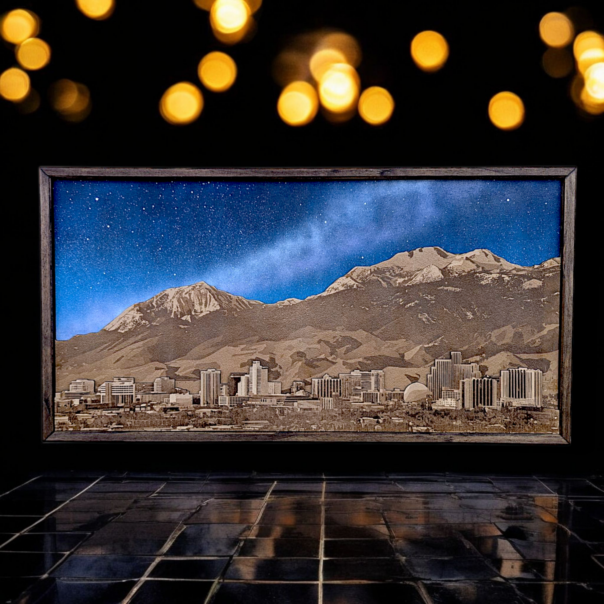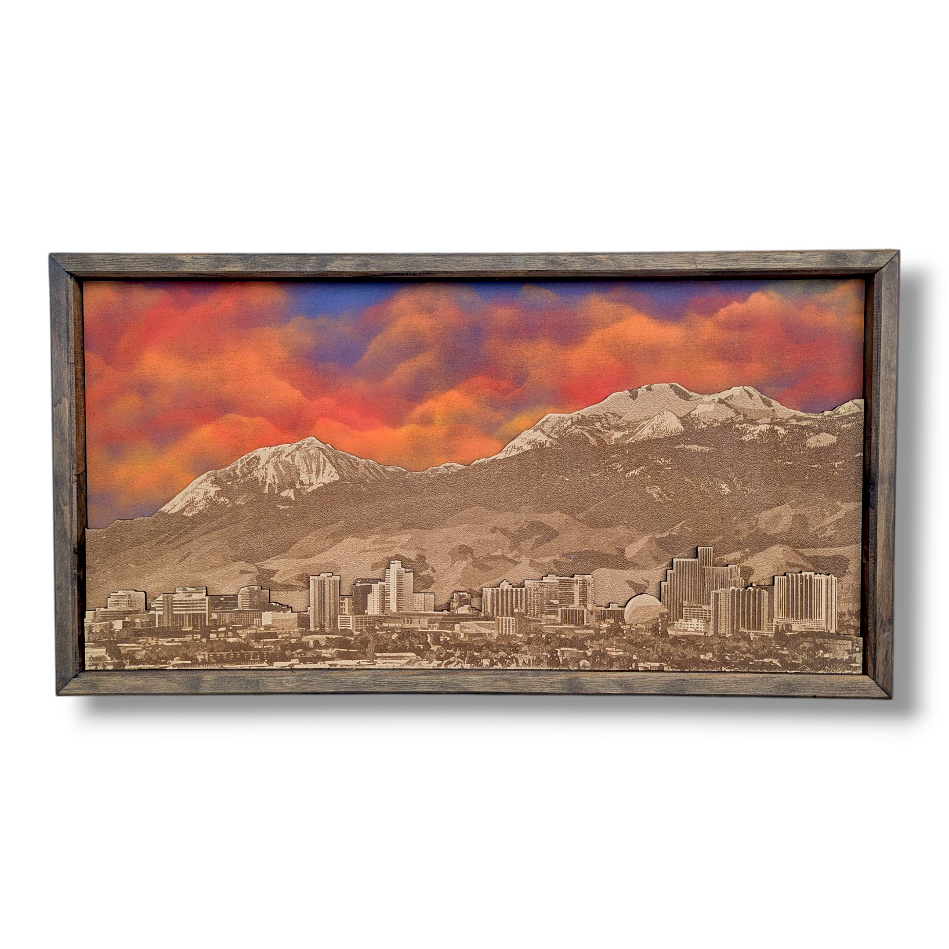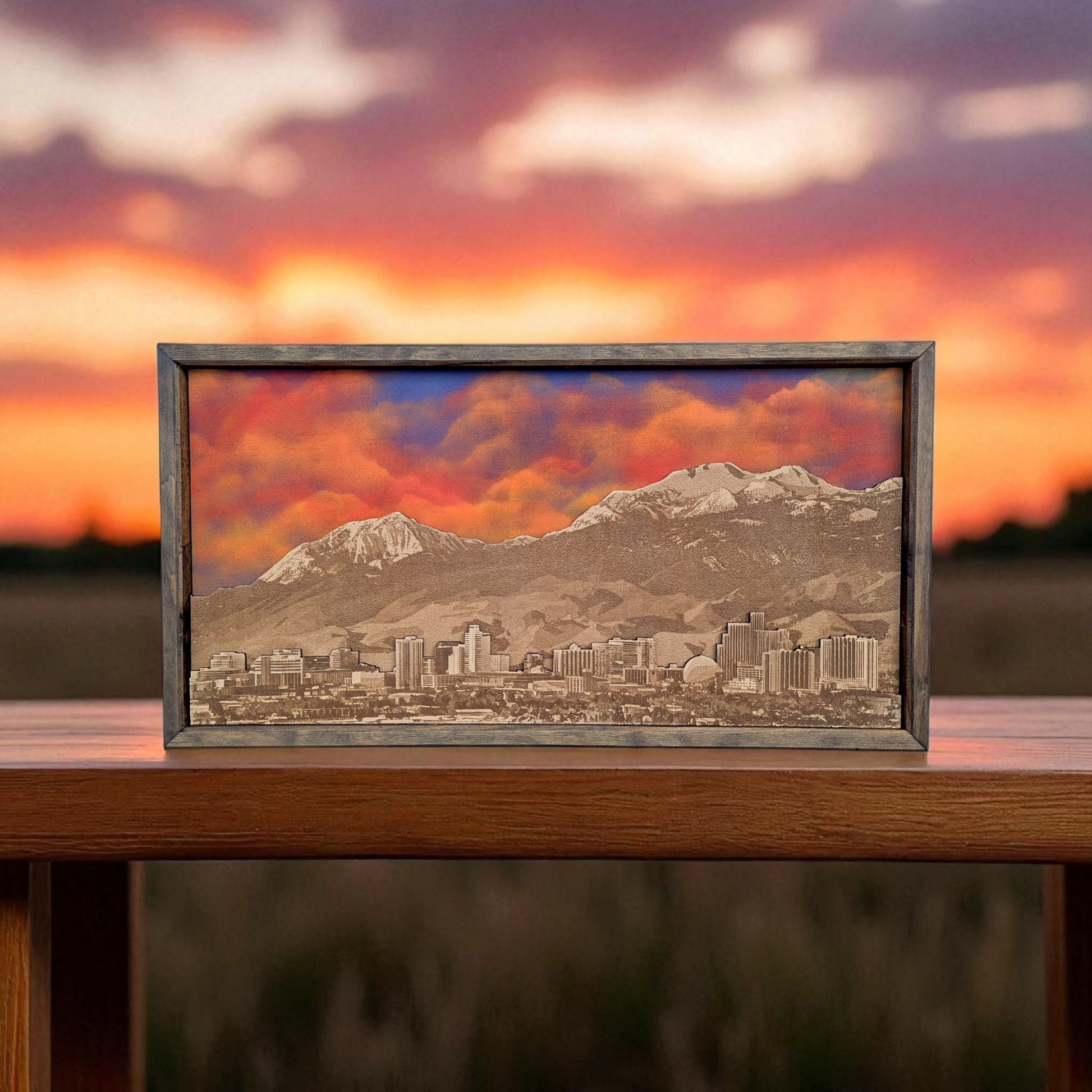 Capture the essence of Reno with this one-of-a-kind, handcrafted art piece. This piece features 3-layers of laser engraved and hand painted wood showcasing the Reno skyline with the majestic mountains behind, bathed in the glow of a starry night. The intricate details and depth make it a captivating addition to any space.
