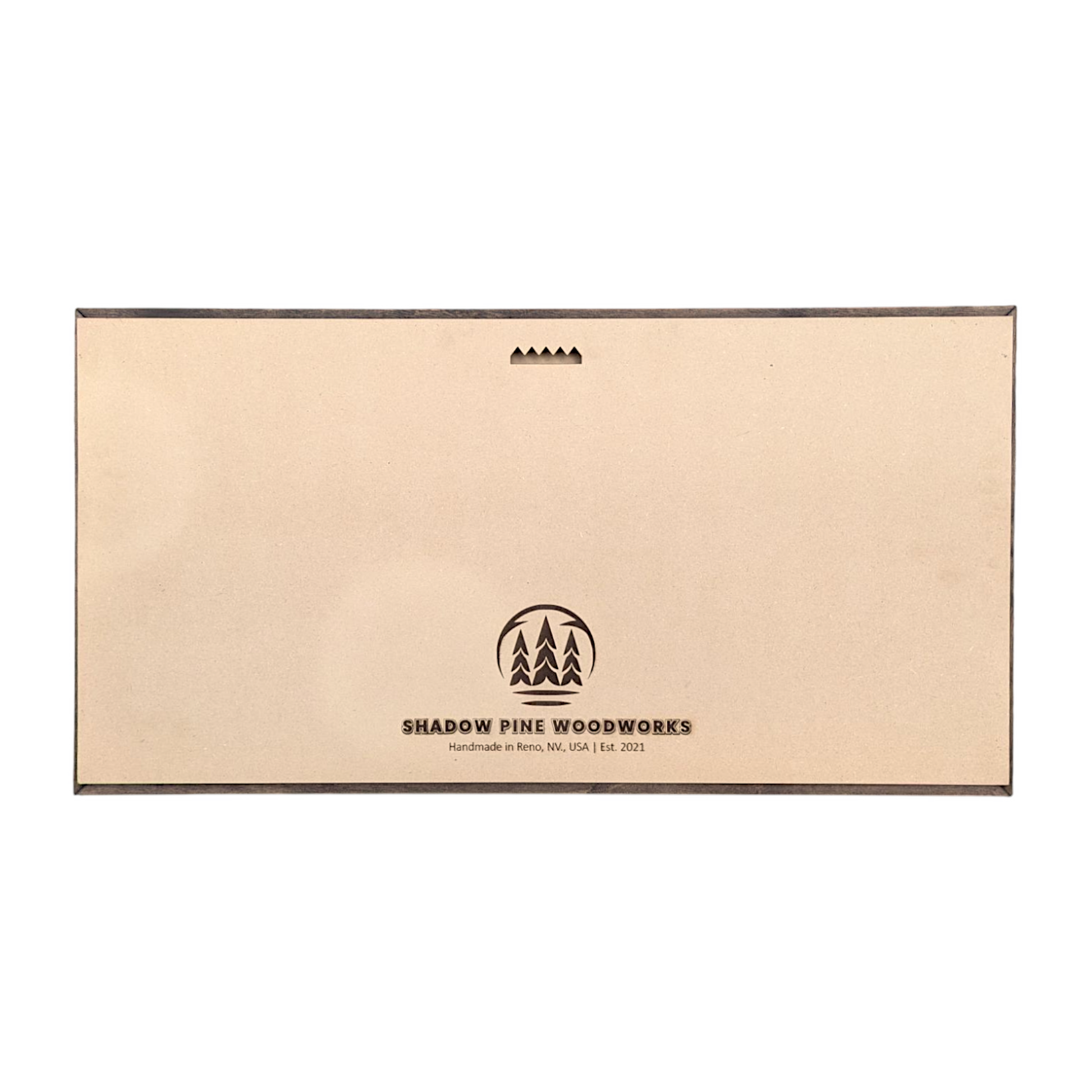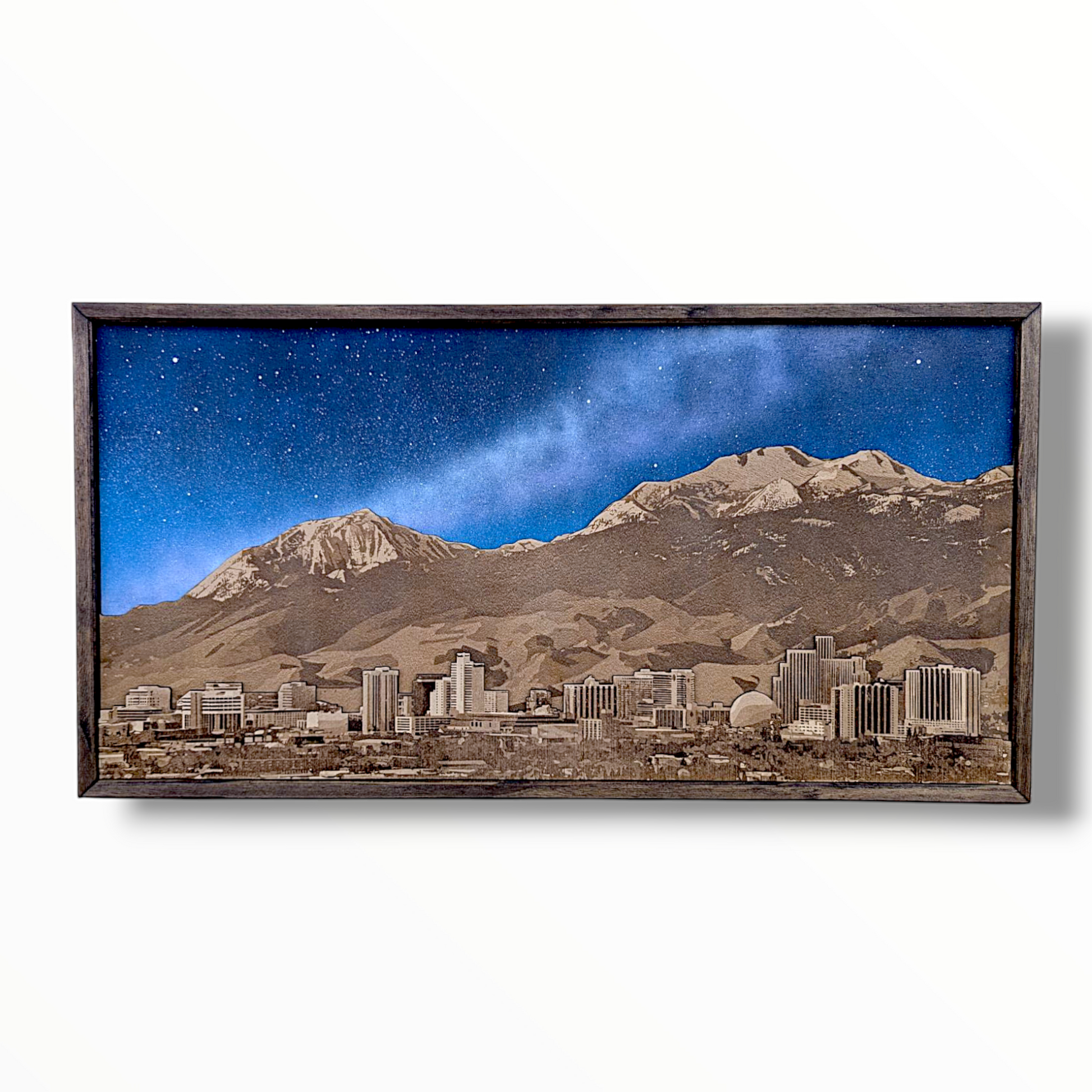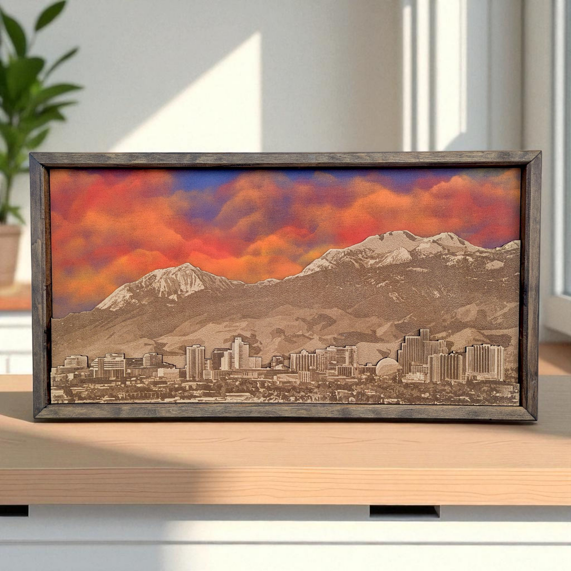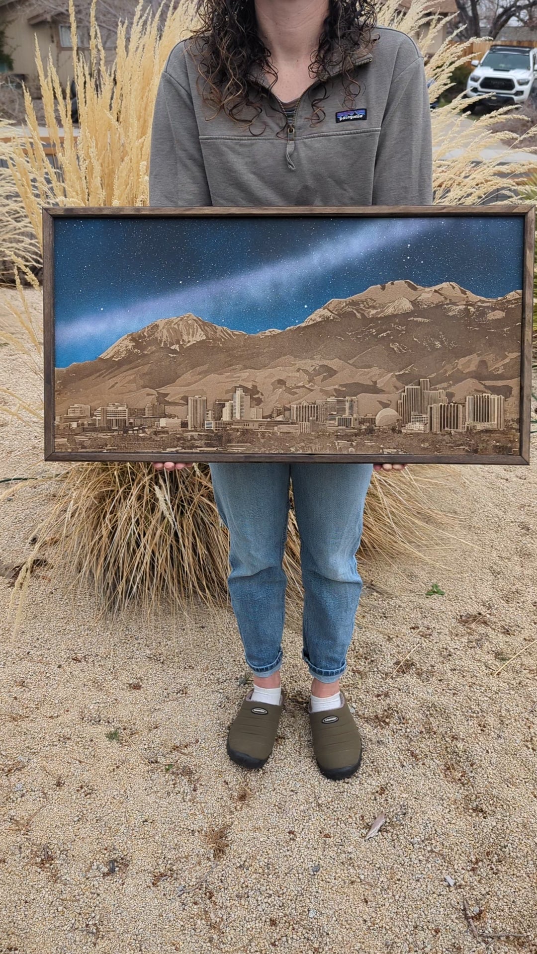 Capture the essence of Reno with this one-of-a-kind, handcrafted art piece. This piece features 3-layers of laser engraved and hand painted wood showcasing the Reno skyline with the majestic mountains behind, bathed in the glow of a starry night. The intricate details and depth make it a captivating addition to any space.