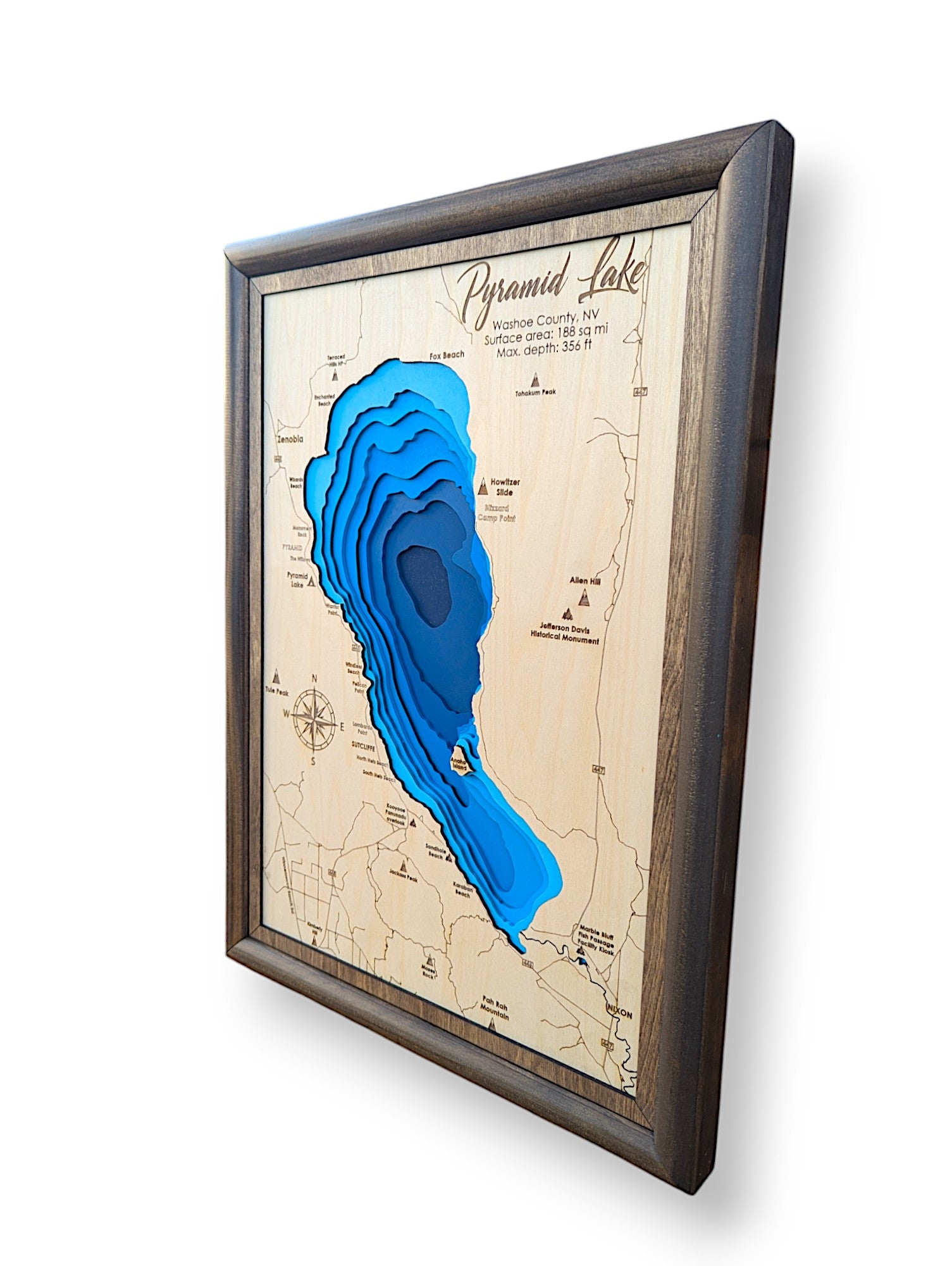 Capture the mystique and timeless beauty of Pyramid Lake with this one-of-a-kind bathymetric wood map wall art. Located in the high desert of northern Nevada, Pyramid Lake is known for its striking blue waters, ancient cultural significance, and dramatic landscape. This stunning bathymetric map beautifully illustrates the lake’s unique underwater topography, from its deep basins and submerged rock formations to the defining contours of its shoreline.