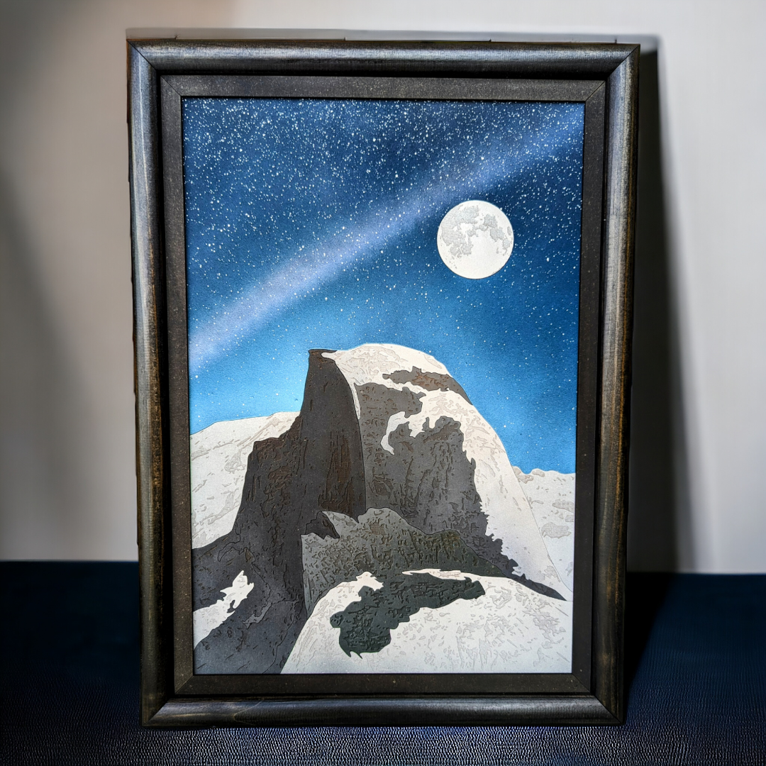 This realistic mountain wood art is constructed with 3 layer of wood. The image was laser cut/engraved, painted, and stained to create a 3-dimensional recreation of Half Dome in the Yosemite valley. This wall hang is a perfect fit for anyone looking to show their love for the mountains, art, and the outdoors.