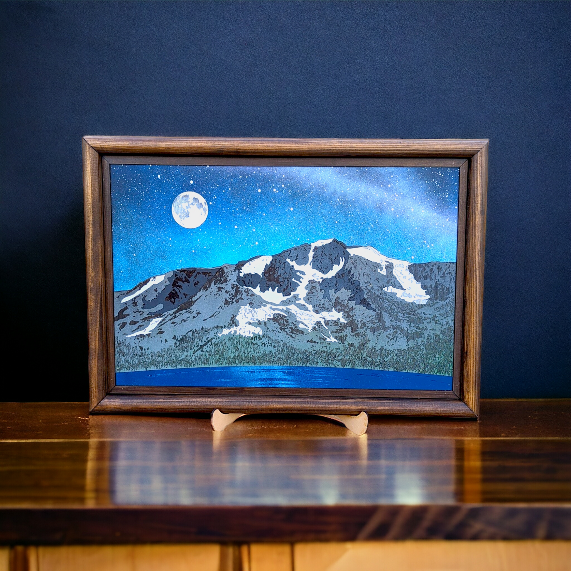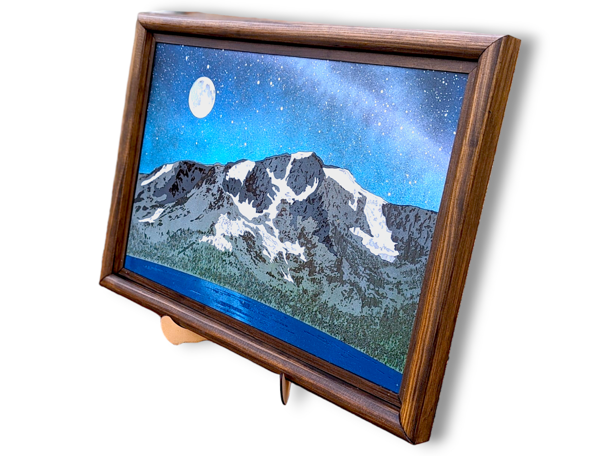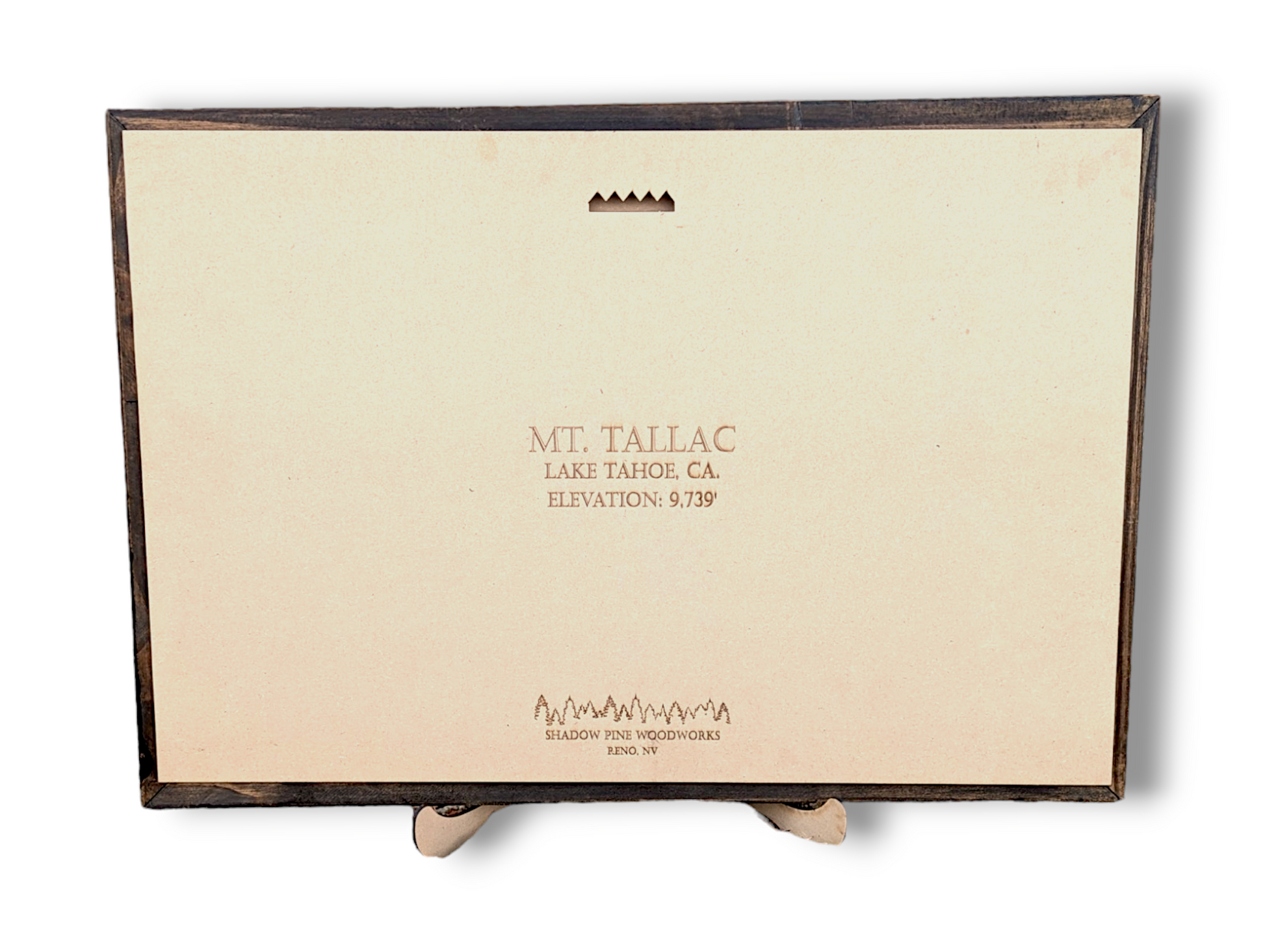 This realistic mountain wood art is constructed with 3 layer of wood. The image was laser cut/engraved, painted, and stained to create a 3-dimensional recreation of Mt. Tallac in the Lake Tahoe basin. This wall hang is a perfect fit for anyone looking to show their love for the mountains, art, and the outdoors.