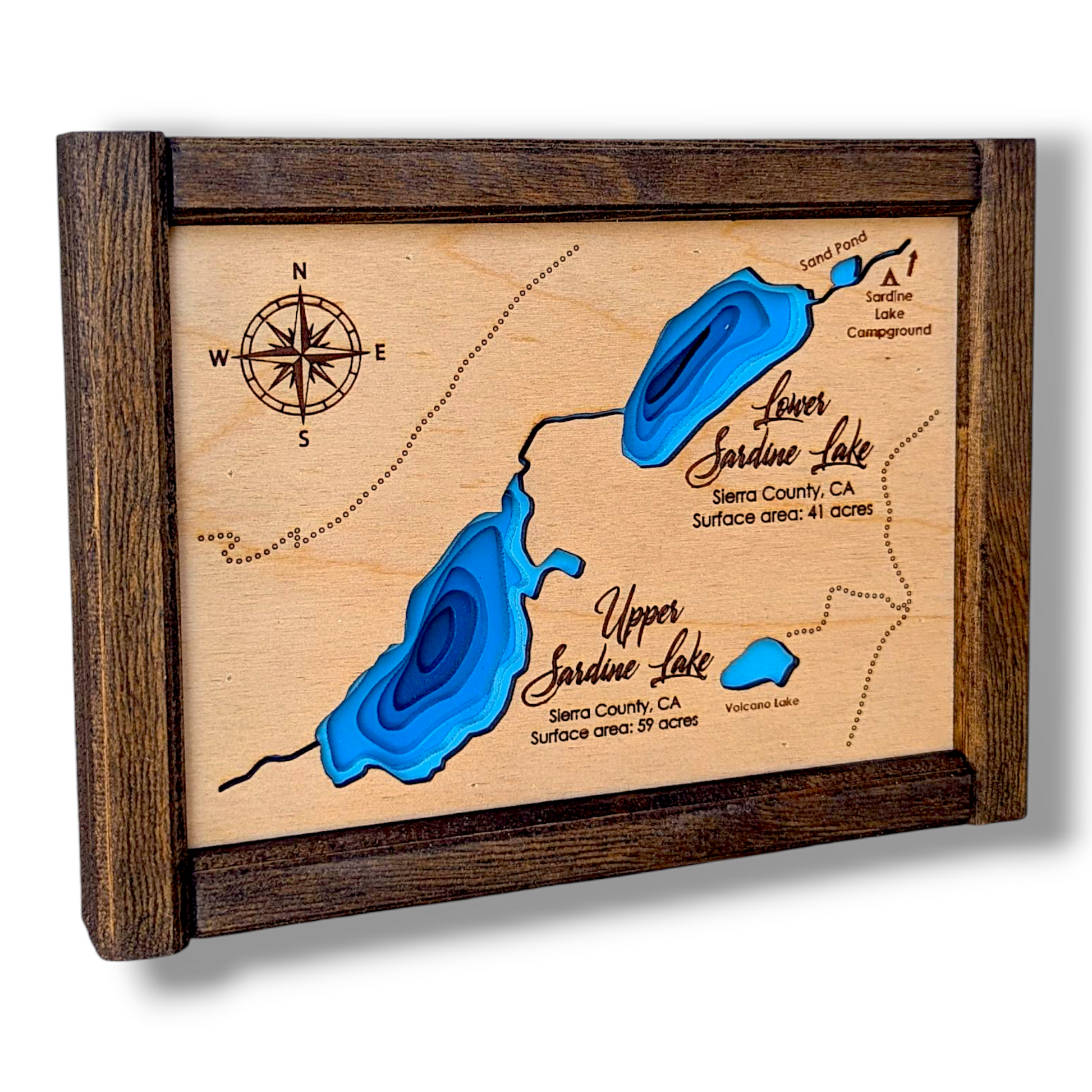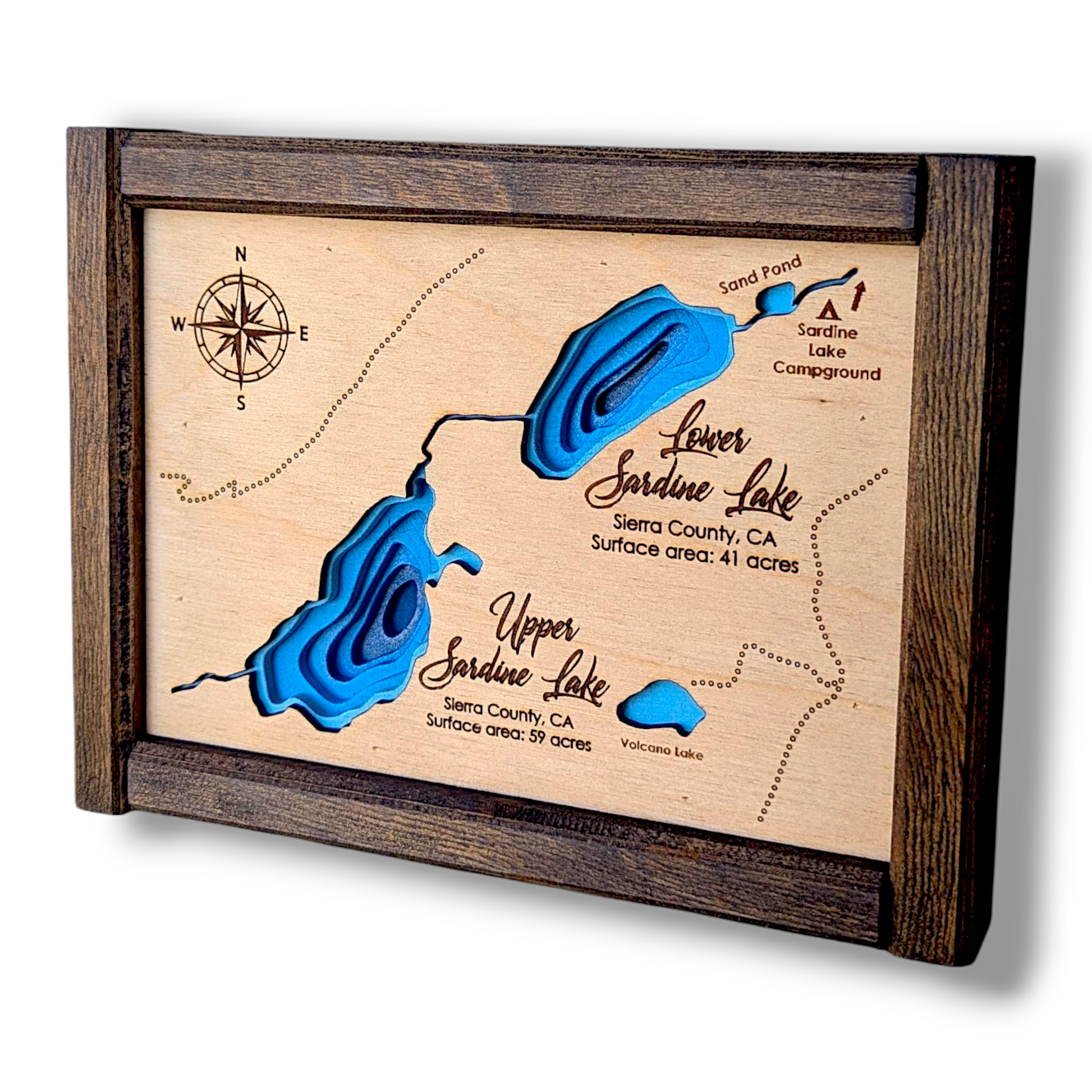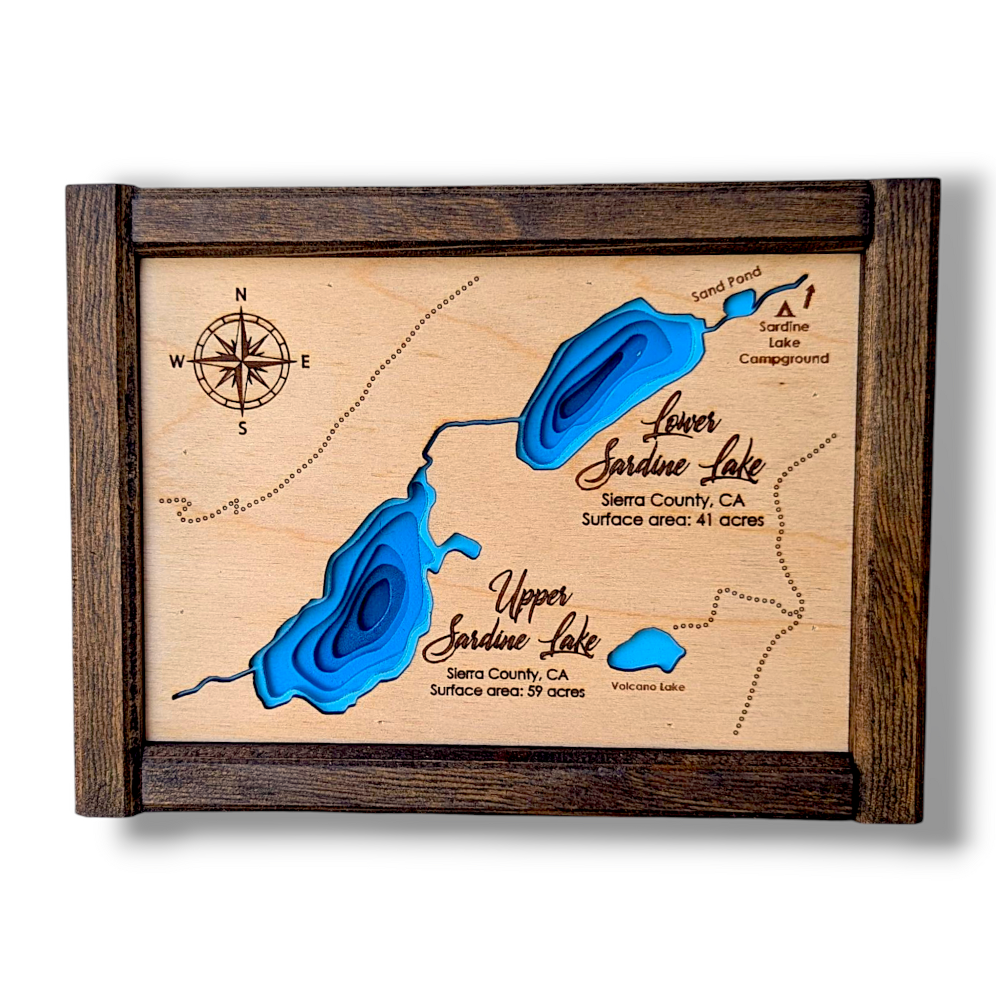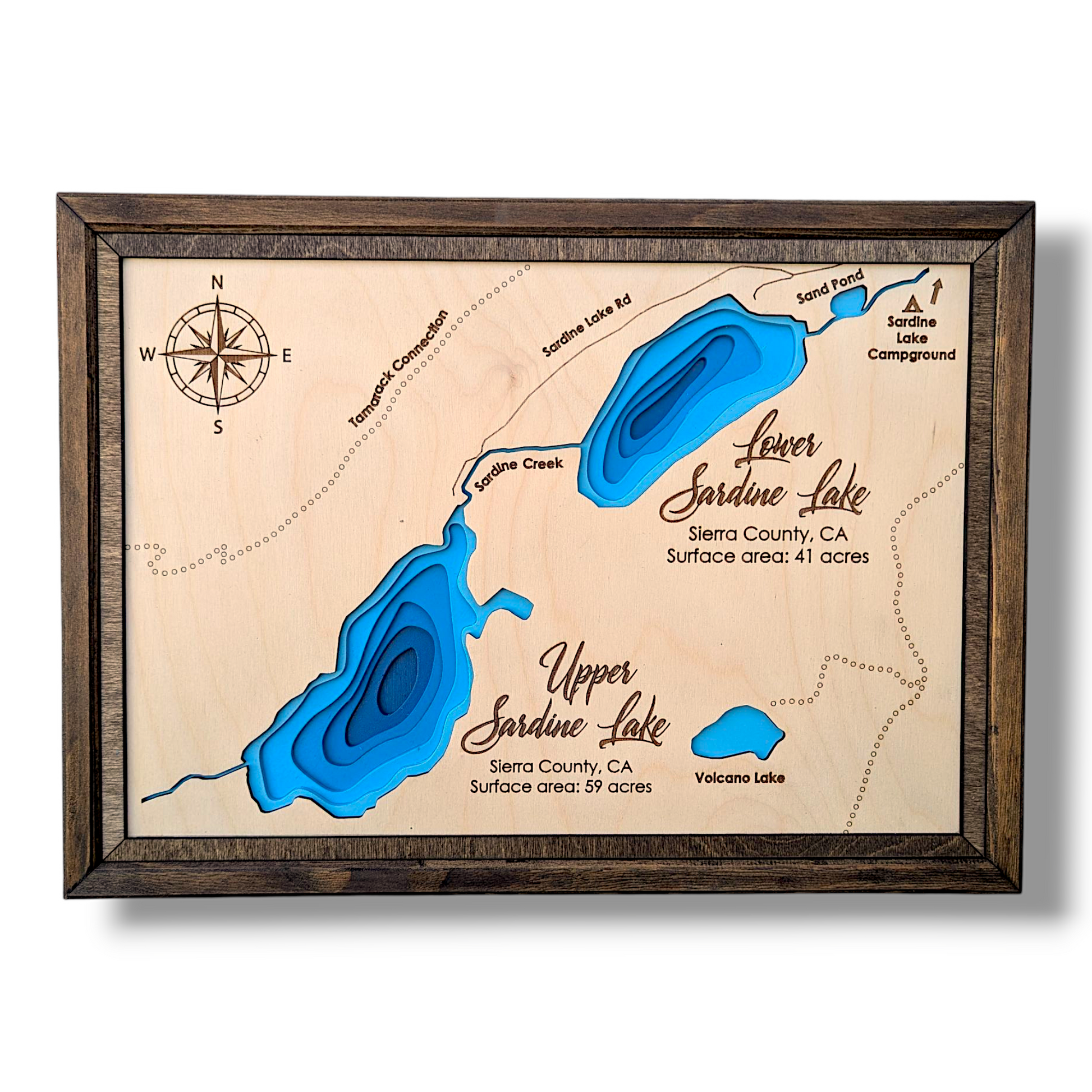 Celebrate the dramatic scenery of the Sierra Buttes with this finely laser-cut wood bathymetry map featuring Upper and Lower Sardine Lakes. Nestled in the heart of the Lakes Basin Recreation Area near Graeagle, California, these twin lakes offer a breathtaking alpine escape—framed by granite peaks, pine forests, and crystal-clear waters. This handcrafted map captures the distinct contours and tranquil charm of both lakes in one elegant piece.