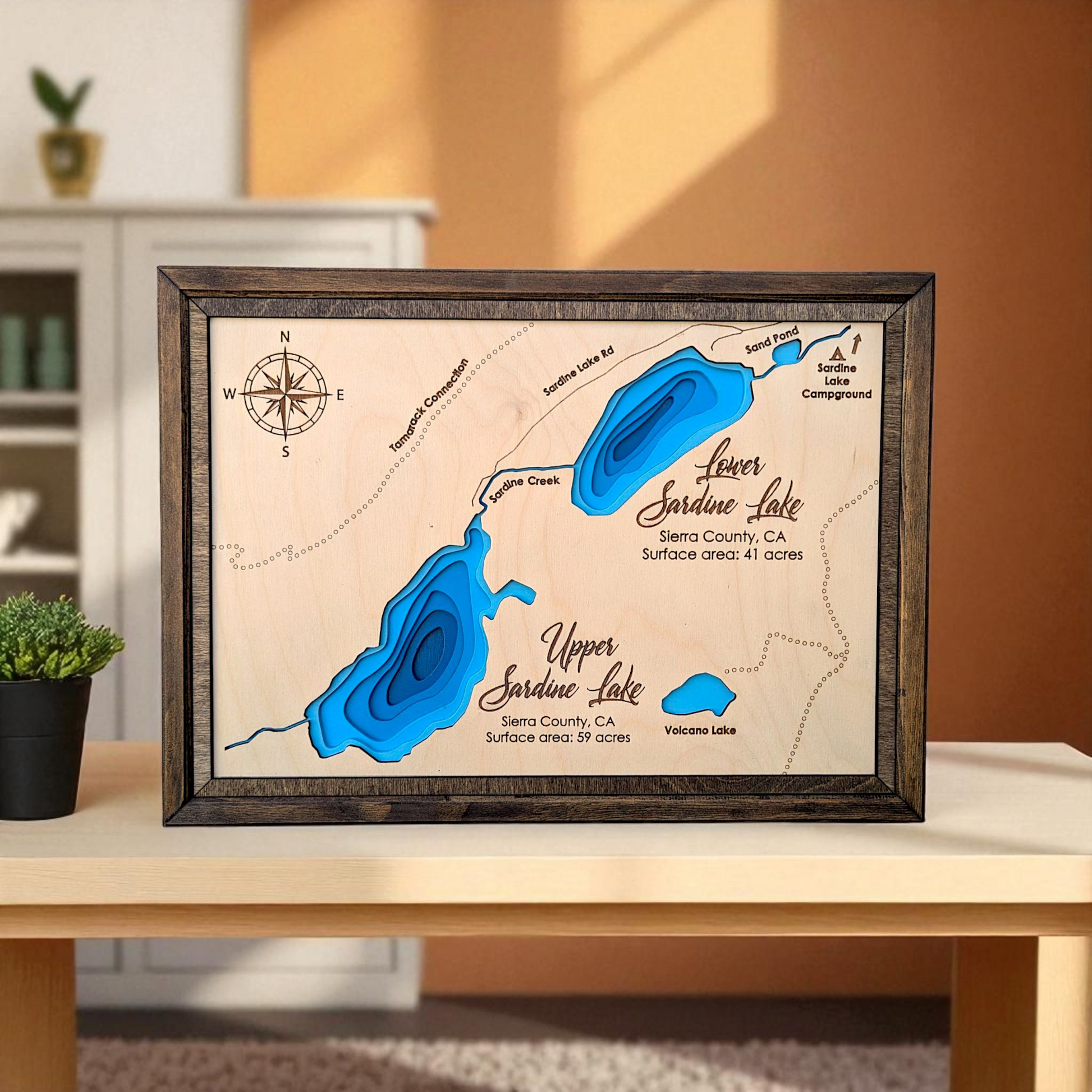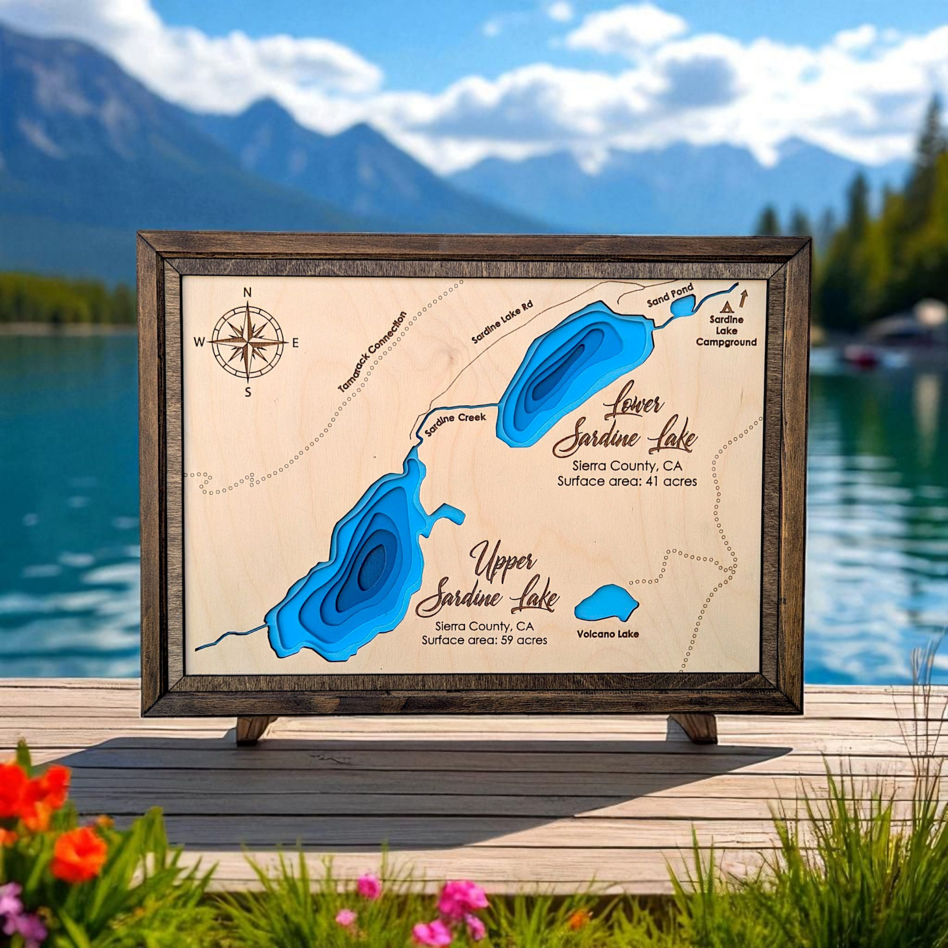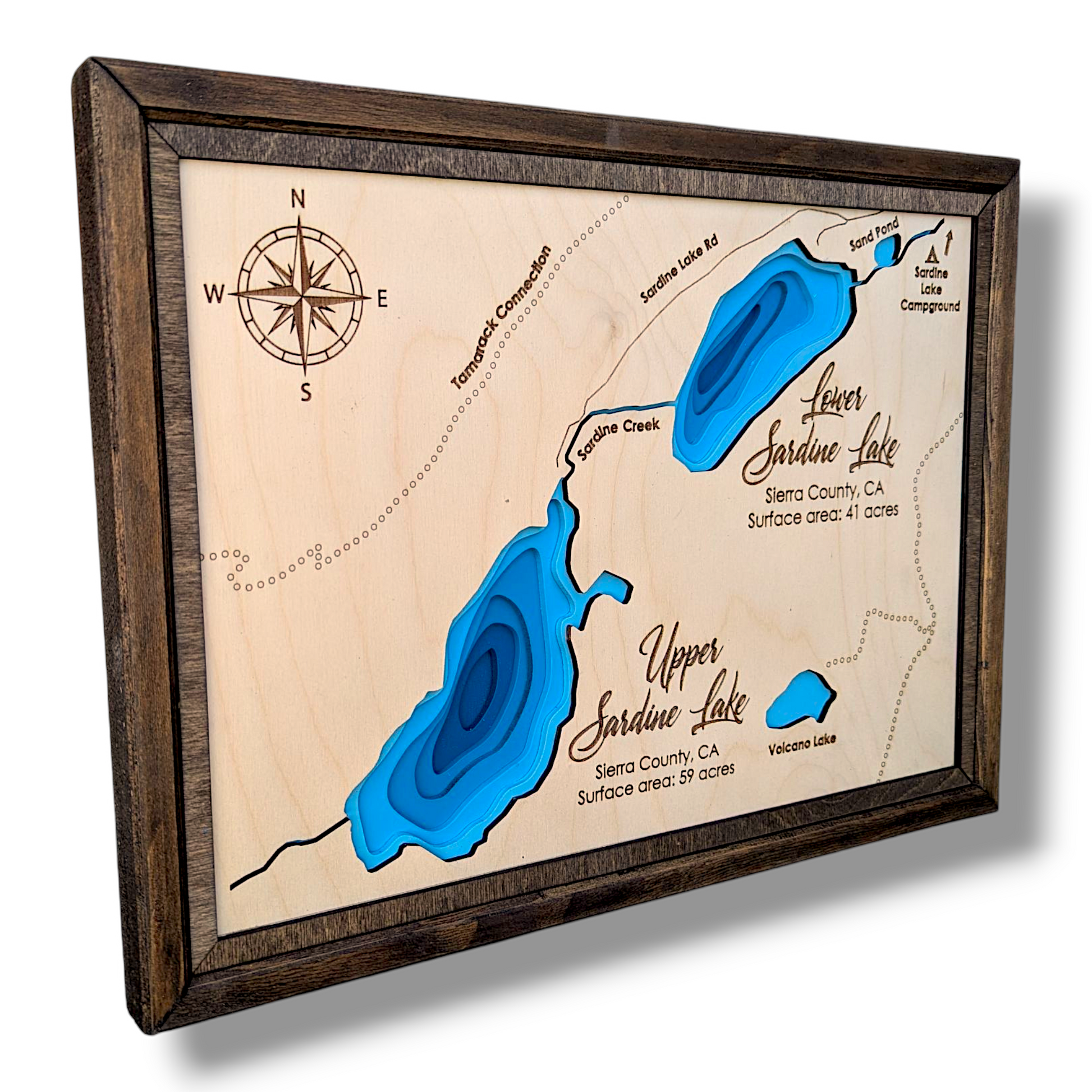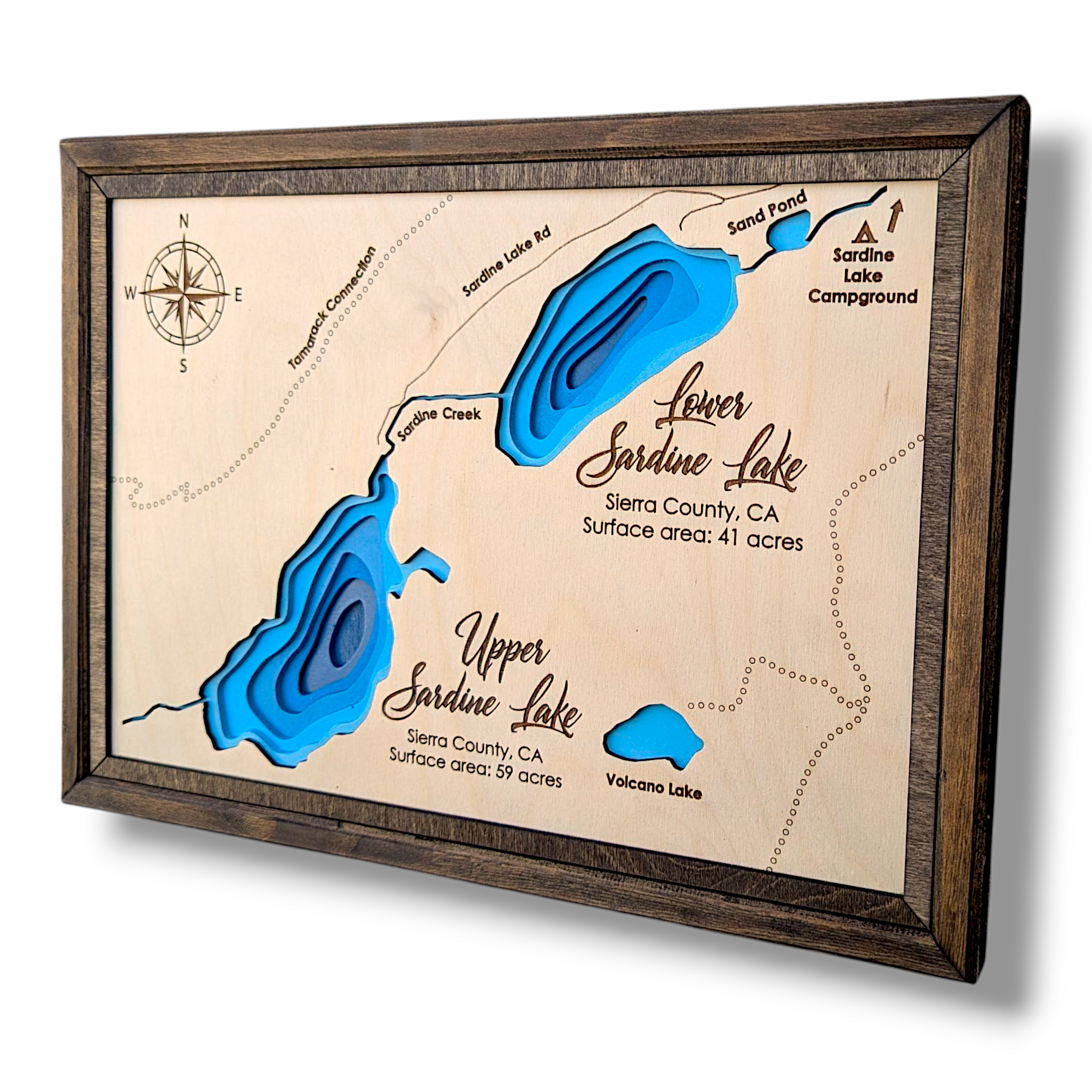 Celebrate the dramatic scenery of the Sierra Buttes with this finely laser-cut wood bathymetry map featuring Upper and Lower Sardine Lakes. Nestled in the heart of the Lakes Basin Recreation Area near Graeagle, California, these twin lakes offer a breathtaking alpine escape—framed by granite peaks, pine forests, and crystal-clear waters. This handcrafted map captures the distinct contours and tranquil charm of both lakes in one elegant piece.