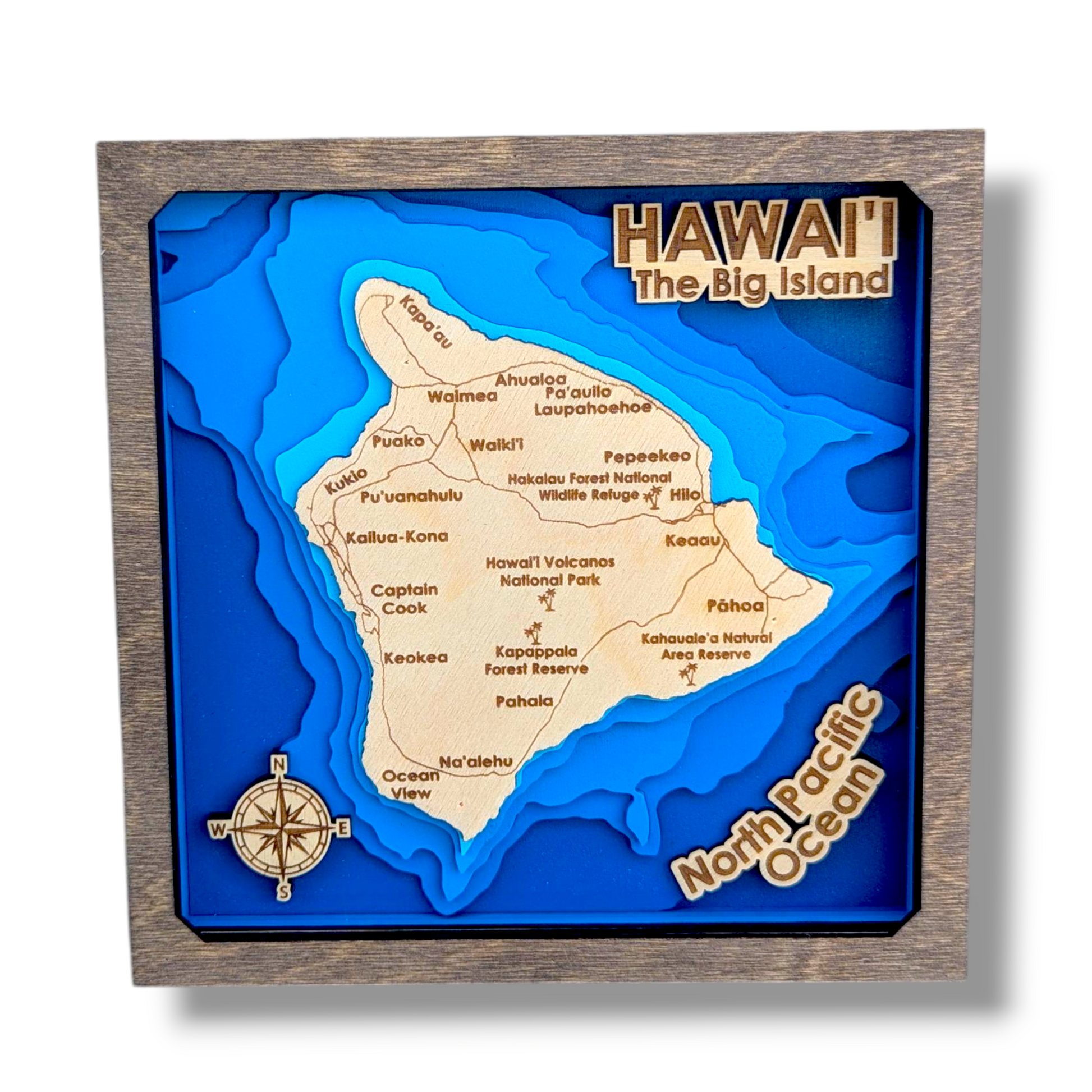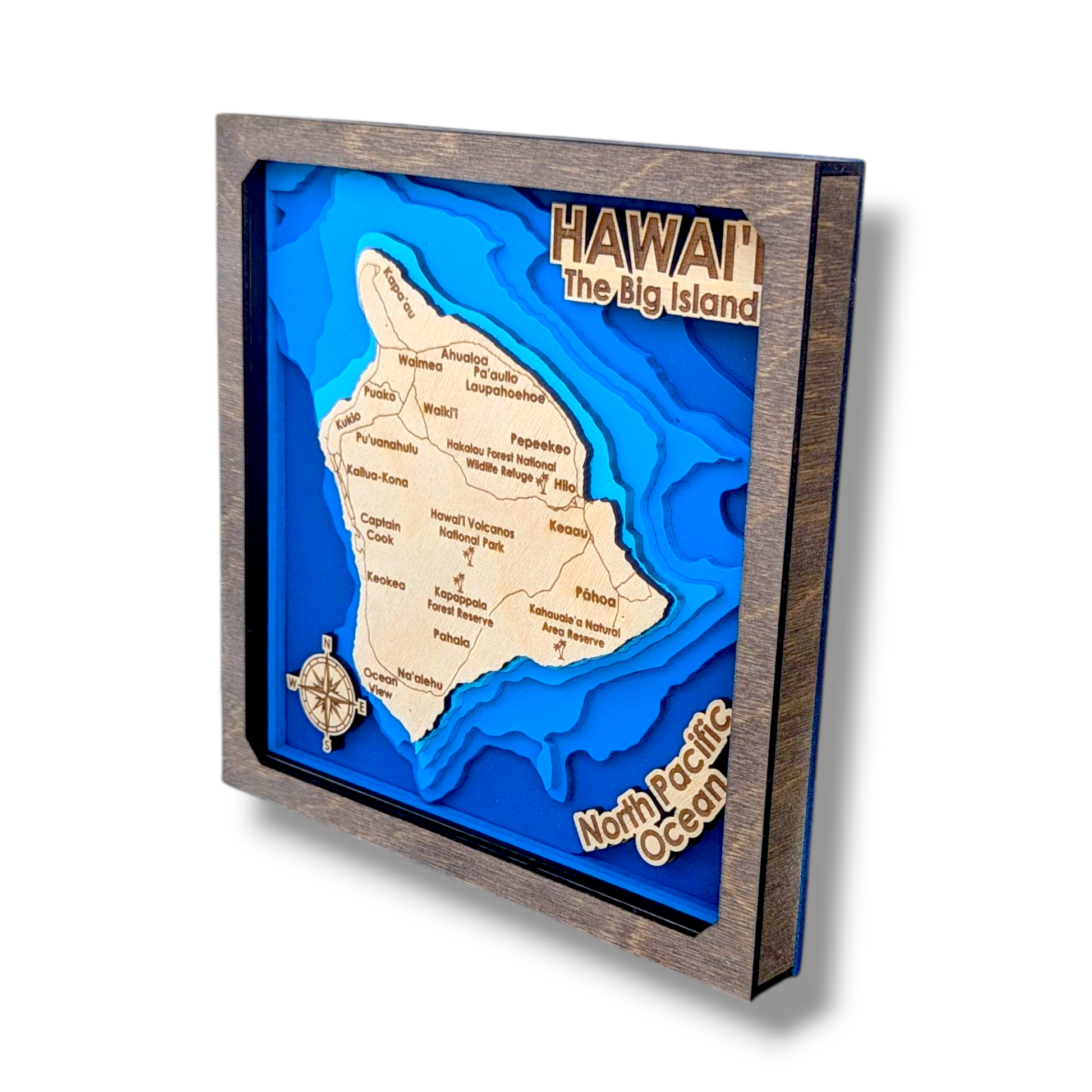 This Hawaiian Island inspired art piece is constructed with 9 layers of wood cut, engraved, and painted to showcase a dramatic color fade within bathymetric depth lines of the The Big Island. This wall hang is a perfect fit for anyone looking to showcase their love for art, maps, and the stunning Big Island of Hawaii. There are two frame color options in my store, and I can also create a custom variants upon request (more info on custom work and inventory below).