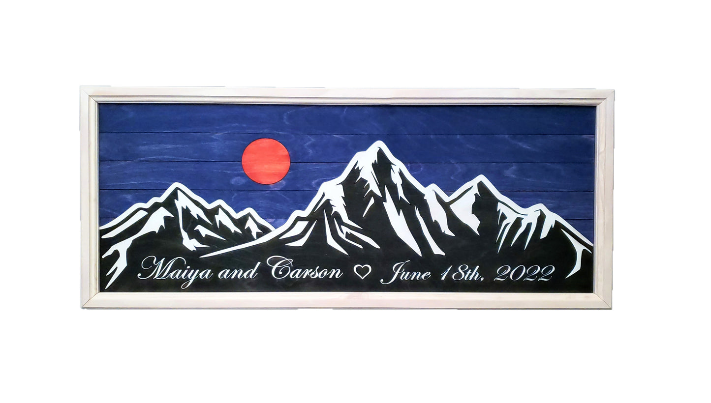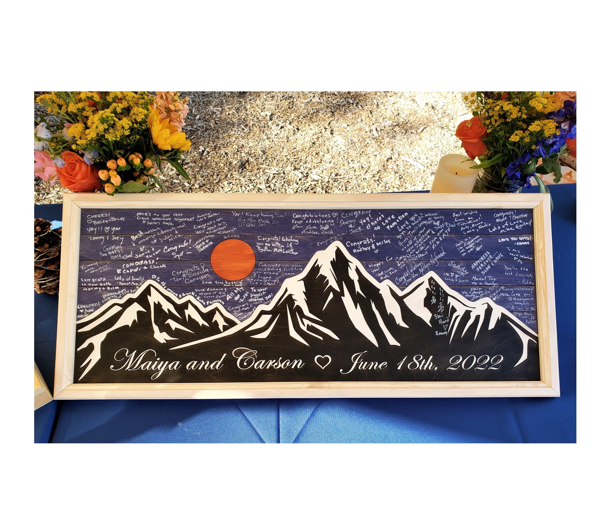 These pieces are built with 100% wood stained and painted to create a mountain landscape. The entire piece (including the names and dates of the couple) are inlaid in wood to ensure you will never experience paint fade or chipping. Two white paint pens are included with the product which allow guests to permanently write their messages in the sky or on the mountain. The pictured piece was from a wedding of 130 guests. For larger weddings, dimensions can be customized (see below under "the process" for more info). The piece comes framed (as pictured) and includes a wall hanging bracket mounted to the back.