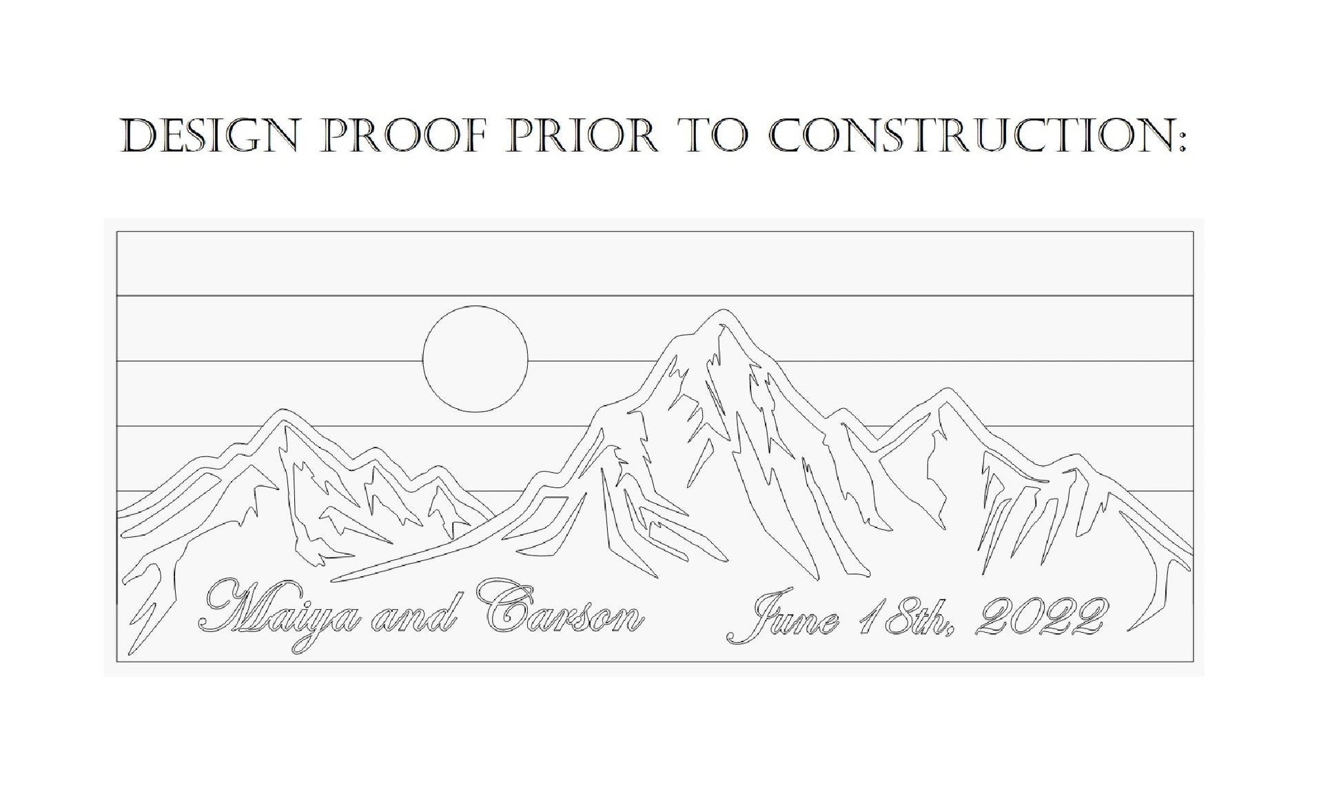Once the order is placed, Shadow Pine will contact you within two business days to gather additional information regarding the inlaid text, desired colors, sizing, and framing. The standard sizing of this piece is 31"X13", which should accommodate roughly 150 wedding guests. For custom sizing, please message Shadow Pine BEFORE ordering. We will create a custom listing for you to purchase. Lastly, a "proof of design" (as pictured above) will be provided prior to initiating work. Once in agreement, work will start!